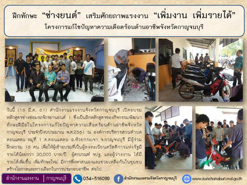 วันนี้ (16 มี.ค. 61) สำนักงานแรงงานจังหวัดกาญจนบุรี เปิดอบรมหลักสูตรช่างซ่อมรถจักรยานยนต์ 1 ซึ่งเป็นอีกหลักสูตรของกิจกรรมพัฒนาทักษะฝีมือในโครงการแก้ไขปัญหาความเดือดร้อนด้านอาชีพจังหวัดกาญจนบุรี ประจำปีงบประมาณ พ.ศ.2561 ณ องค์การบริหารส่วนตำบลดอนแสลบ หมู่ที่ 1 ต.ดอนแสลบ อ.ห้วยกระเจา จ.กาญจนบุรี มีผู้ร่วมฝึกอบรม 16 คน เพื่อให้ผู้เข้าอบรมที่เป็นผู้ลงทะเบียนสวัสดิการแห่งรัฐมีรายได้น้อยกว่า 30,000 บาท/ปี ผู้ตกเกณฑ์ จปฐ. และผู้ว่างงาน ได้มีรายได้เพิ่มขึ้น เพิ่มทักษะใหม่ มีการพึ่งพาตนเองและช่วยเหลือกันในชุมชน สร้างโอกาสและทางเลือกในการประกอบอาชีพ ต่อไป