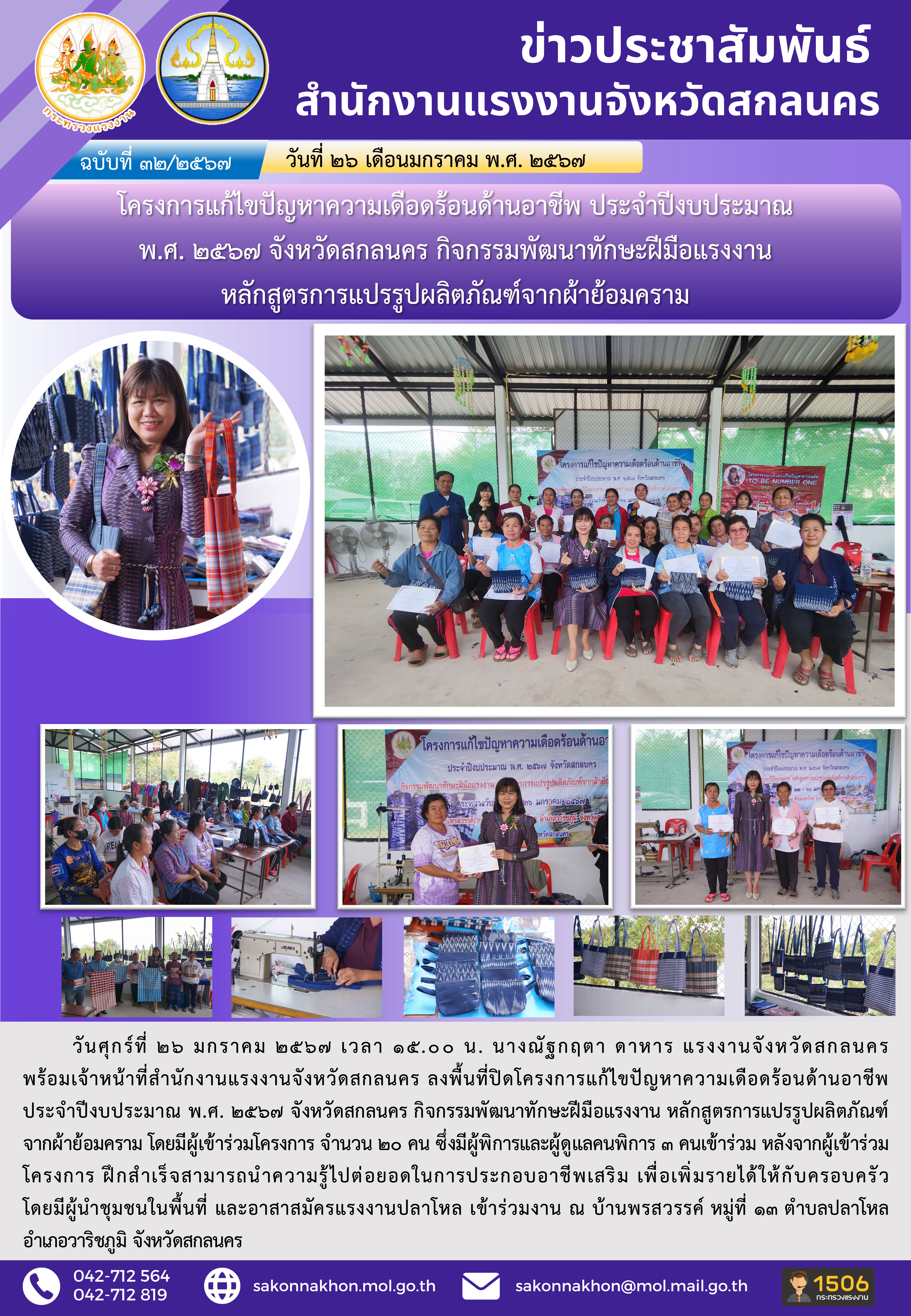สรจ.สกลนคร ลงพื้นที่ปิดโครงการแก้ไขปัญหาความเดือดร้อนด้านอาชีพ ประจำปีงบประมาณ พ.ศ. 2567 จังหวัดสกลนคร กิจกรรมพัฒนาทักษะฝีมือแรงงาน หลักสูตรการเพาะเห็ดเศรษฐกิจ