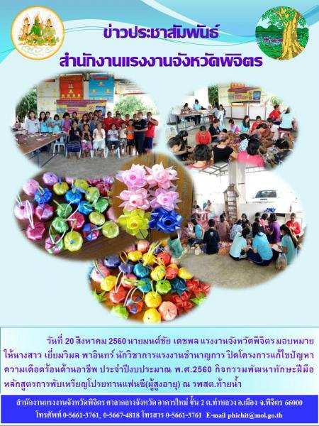 เมื่อวันที่ 20 สิงหาคม 2560 นายมนต์ชัย เดชพล แรงงานจังหวัดพิจิตร มอบหมายให้นางสาว เยี่ยมวิมล พาอินทร์ นักวิชาการแรงงานชำนาญการ ปิดโครงการแก้ไขปัญหาความเดือดร้อนด้านอาชีพ ประจำปีงบประมาณ พ.ศ.2560 กิจกรรมพัฒนาทักษะฝีมือ หลักสูตรการพับเหรียญโปรยทานแฟนซี(ผู้สูงอายุ) ณ รพสต.ท้ายน้ำ