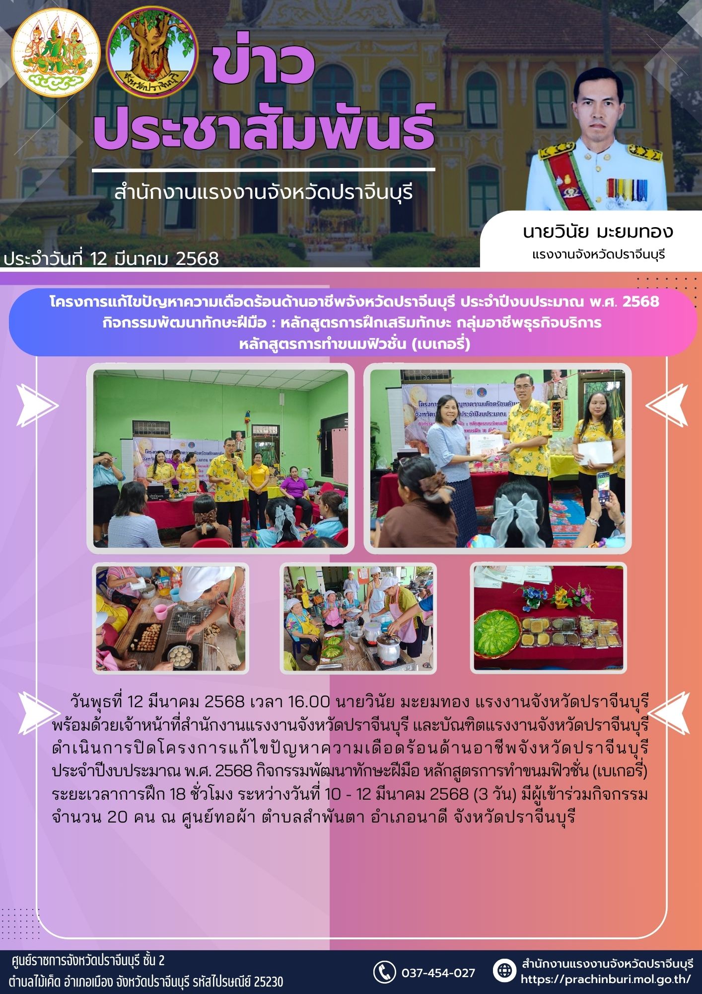 โครงการแก้ไขปัญหาความเดือดร้อนด้านอาชีพจังหวัดปราจีนบุรี ประจำปีงบประมาณ พ.ศ. 2568 กิจกรรมพัฒนาทักษะฝีมือ : หลักสูตรการฝึกเสริมทักษะ กลุ่มอาชีพธุรกิจบริการ หลักสูตรการทำขนมฟิวชั่น (เบเกอรี่)