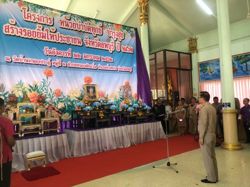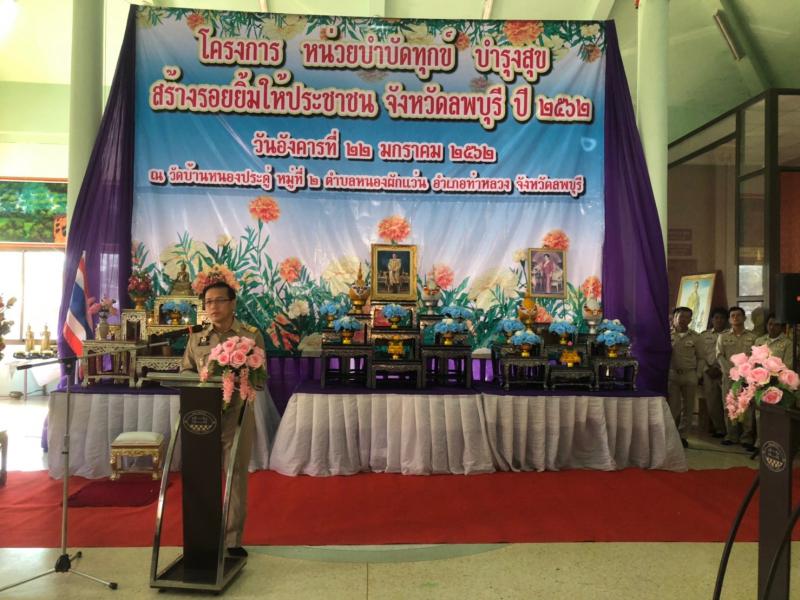 วันอังคารที่ 22 มกราคม 2562 : 07.30 น. นางสาวปาริชาติ สวนใจ แรงงานจังหวัดอุตรดิตถ์ รักษาราชการแทน แรงงานจังหวัดลพบุรี มอบหมายให้นางสาวสมาพร สว่างศรี นักวิชาการแรงงานชำนาญการ พร้อมด้วยนางสาวอมรรัตน์ อินทราภา นักวิชาการแรงงาน ร่วมโครงการ “หน่วยบำบัดทุกข์ บำรุงสุข สร้างรอยยิ้มให้ประชาชน จังหวัดลพบุรี ปี 2562” ณ วัดหนองประดู่ หมู่ที่ 2 ตำบลหนองผักแว่น อำเภอท่าหลวง จังหวัดลพบุรี เพื่อนำบริการต่างๆ ของกระทรวงแรงงาน ไปให้บริการประชาชนในพื้นที่
