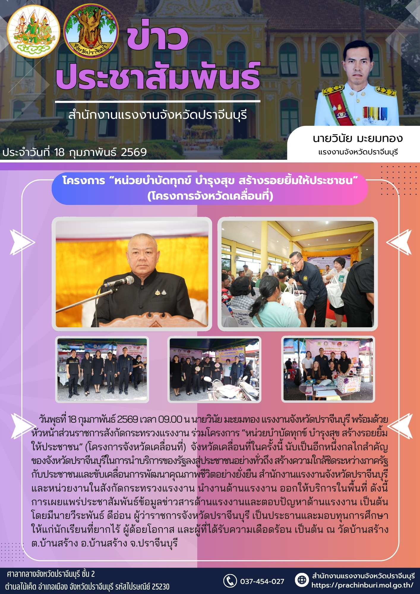 วันพุธที่ 18 กุมภาพันธ์ 2569 เวลา 09.00 น นายวินัย มะยมทอง แรงงานจังหวัดปราจีนบุรี พร้อมด้วยหัวหน้าส่วนราชการสังกัดกระทรวงแรงงาน ร่วมโครงการ “หน่วยบำบัดทุกข์ บำรุงสุข สร้างรอยยิ้มให้ประชาชน” (โครงการจังหวัดเคลื่อนที่) จังหวัดเคลื่อนที่ในครั้งนี้ นับเป็นอีกหนึ่งกลไกสำคัญของจังหวัดปราจีนบุรีในการนำบริการของรัฐลงสู่ประชาชนอย่างทั่วถึง สร้างความใกล้ชิดระหว่างภาครัฐกับประชาชนและขับเคลื่อนการพัฒนาคุณภาพชีวิตอย่างยั่งยืน สำนักงานแรงงานจังหวัดปราจีนบุรีและหน่วยงานในสังกัดกระทรวงแรงงาน นำงานด้านแรงงาน ออกให้บริการในพื้นที่ ดังนี้ การเผยแพร่ประชาสัมพันธ์ข้อมูลข่าวสารด้านแรงงานและตอบปัญหาด้านแรงงาน เป็นต้น โดยมีนายวีระพันธ์ ดีอ่อน ผู้ว่าราชการจังหวัดปราจีนบุรี เป็นประธานและมอบทุนการศึกษาให้แก่นักเรียนที่ยากไร้ ผู้ด้อยโอกาส และผู้ที่ได้รับความเดือดร้อน เป็นต้น ณ วัดบ้านสร้าง ต.บ้านสร้าง อ.บ้านสร้าง จ.ปราจีนบุรี