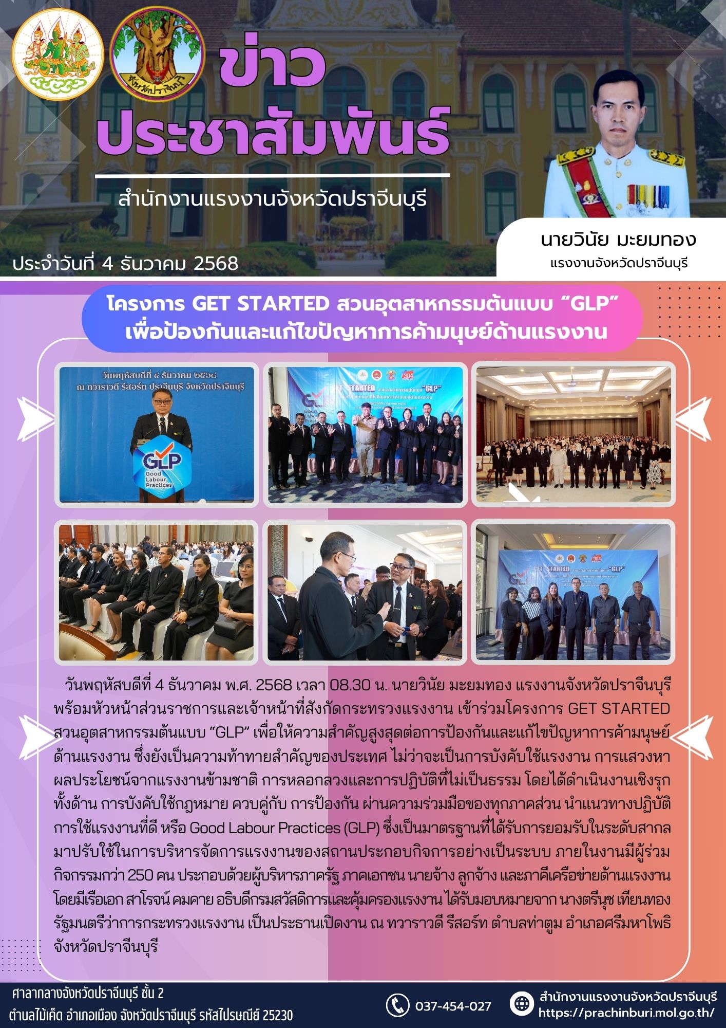วันพฤหัสบดีที่ 4 ธันวาคม พ.ศ. 2568 เวลา 08.30 น. นายวินัย มะยมทอง แรงงานจังหวัดปราจีนบุรี พร้อมหัวหน้าส่วนราชการและเจ้าหน้าที่สังกัดกระทรวงแรงงาน เข้าร่วมโครงการ GET STARTED สวนอุตสาหกรรมต้นแบบ “GLP” เพื่อให้ความสำคัญสูงสุดต่อการป้องกันและแก้ไขปัญหาการค้ามนุษย์ด้านแรงงาน ซึ่งยังเป็นความท้าทายสำคัญของประเทศ ไม่ว่าจะเป็นการบังคับใช้แรงงาน การแสวงหาผลประโยชน์จากแรงงานข้ามชาติ การหลอกลวงและการปฏิบัติที่ไม่เป็นธรรม โดยได้ดำเนินงานเชิงรุก ทั้งด้าน การบังคับใช้กฎหมาย ควบคู่กับ การป้องกัน ผ่านความร่วมมือของทุกภาคส่วน นำแนวทางปฏิบัติการใช้แรงงานที่ดี หรือ Good Labour Practices (GLP) ซึ่งเป็นมาตรฐานที่ได้รับการยอมรับในระดับสากลมาปรับใช้ในการบริหารจัดการแรงงานของสถานประกอบกิจการอย่างเป็นระบบ ภายในงานมีผู้ร่วมกิจกรรมกว่า 250 คน ประกอบด้วยผู้บริหารภาครัฐ ภาคเอกชน นายจ้าง ลูกจ้าง และภาคีเครือข่ายด้านแรงงาน โดยมีเรือเอก สาโรจน์ คมคาย อธิบดีกรมสวัสดิการและคุ้มครองแรงงาน ได้รับมอบหมายจาก นางตรีนุช เทียนทอง รัฐมนตรีว่าการกระทรวงแรงงาน เป็นประธานเปิดงาน ณ ทวาราวดี รีสอร์ท ตำบลท่าตูม อำเภอศรีมหาโพธิ จังหวัดปราจีนบุรี