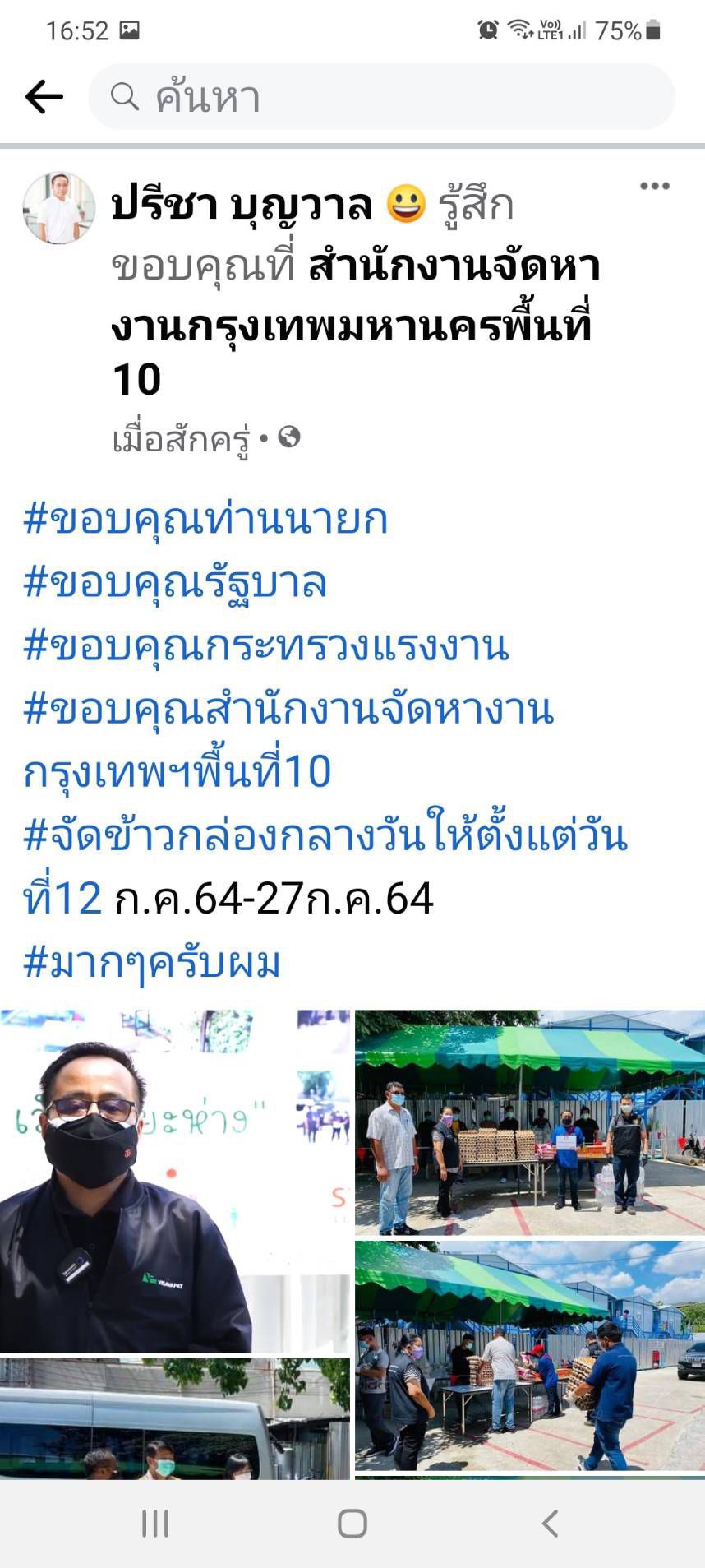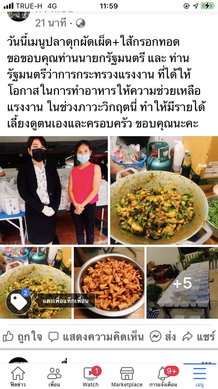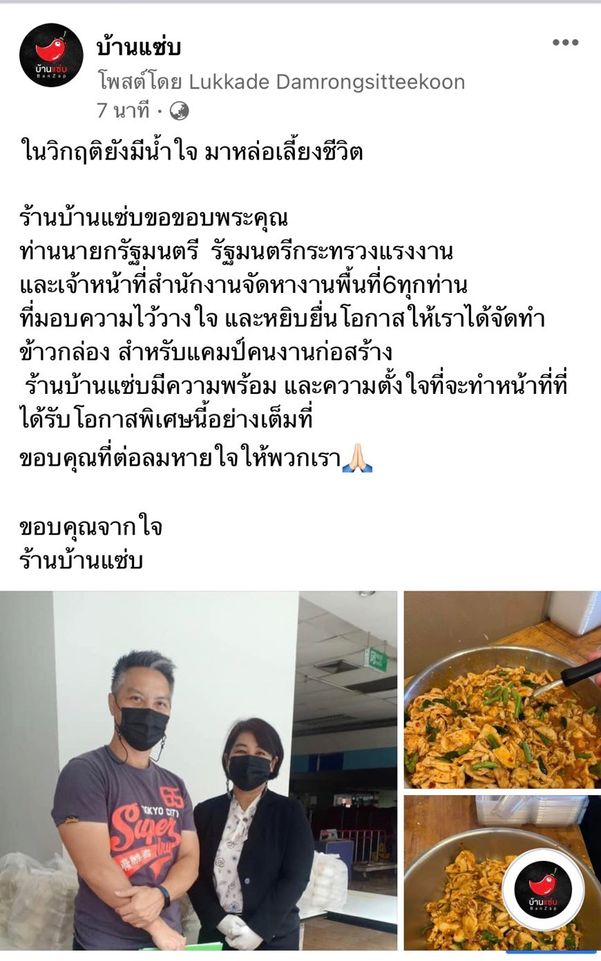 ล่าสุดบนโลกโซเชียลได้มีการแชร์เรื่องราวของผู้ใช้เฟซบุ๊คที่ใช้ชื่อว่า บ้านแซ่บ ได้โพสต์เล่าเรื่องราวที่เจ้าตัวกล่าวถึงโครงการดังกล่าวว่า ในวิกฤติยังมีน้ำใจ มาหล่อเลี้ยงชีวิต ร้านบ้านแซ่บขอขอบพระคุณ ท่านนายกรัฐมนตรี รัฐมนตรีว่าการกระทรวงแรงงาน และเจ้าหน้าที่สำนักงานจัดหางานกรุงเทพมหานครพื้นที่ 6 ทุกท่านที่มอบความไว้วางใจ และหยิบยื่นโอกาสให้เราได้จัดทำข้าวกล่อง สำหรับแคมป์คนงานก่อสร้าง ร้านบ้านแซ่บมีความพร้อมและความตั้งใจที่จะทำหน้าที่ที่ได้รับโอกาสพิเศษนี้อย่างเต็มที่ ขอบคุณที่ต่อลมหายใจให้พวกเรา เฟซบุ๊คอีกรายได้แชร์เรื่องราวเกี่ยวกับโครงการจัดทำข้าวกล่องส่งแคมป์คนงานว่า วันนี้เมนูปลาดุกผัดเผ็ด + ไส้กรอกทอด ขอขอบคุณท่านนายกรัฐมนตรี และท่านรัฐมนตรีว่าการกระทรวงแรงงาน ที่ได้ให้โอกาสในการทำอาหารให้ความช่วยเหลือแรงงาน ในช่วงภาวะวิกฤตินี้ ทำให้มีรายได้เลี้ยงดูตนเองและครอบครัว