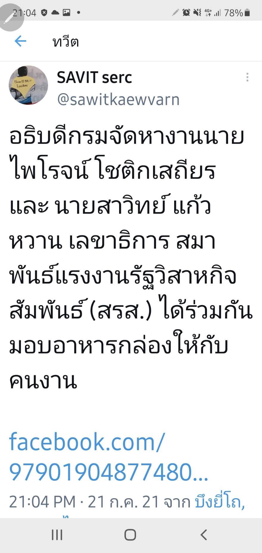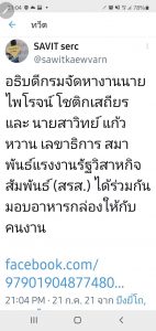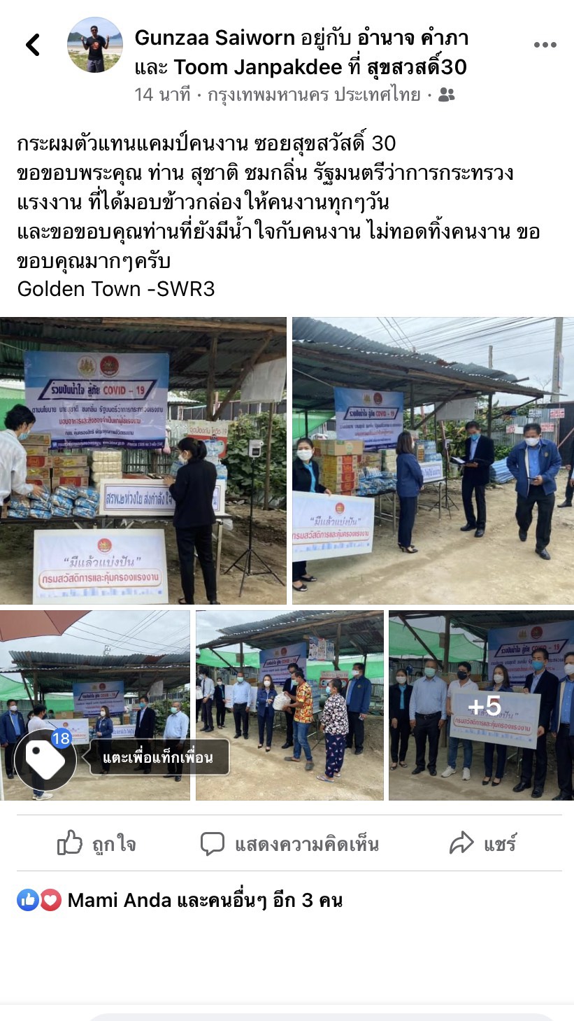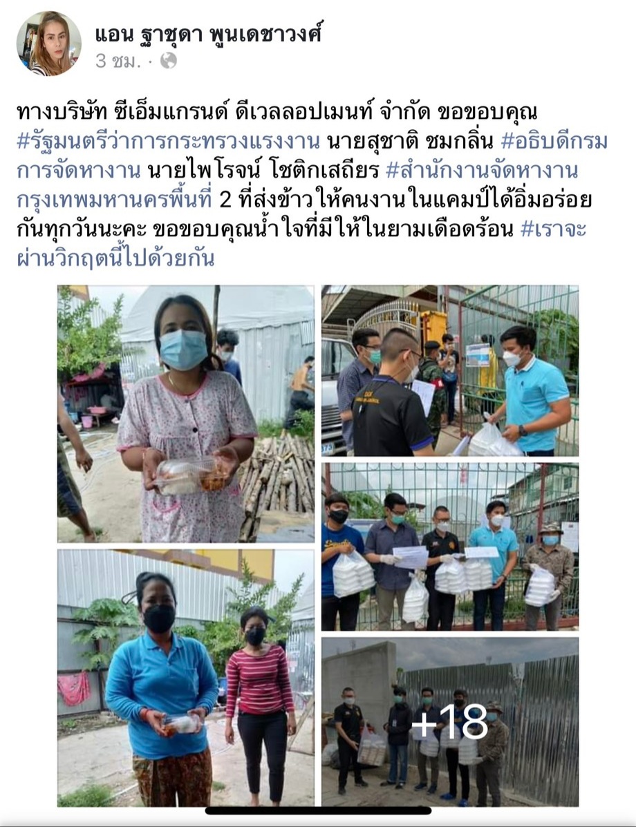 ส่วนตัวแทนแคมป์คนงานรายหนึ่งอาศัยอยู่ในย่านสุขสวัสดิ์ 30 โพสต์ข้อความในโซเชียวว่า กระผมเป็นตัวแทนแคมป์คนงาน ซอยสุขสวัสดิ์ 3 ขอขอบพระคุณ ท่านสุชาติ ชมกลิ่น รัฐมนตรีว่าการกระทรวงแรงงาน ที่ได้มอบข้าวกล่องให้คนงานทุก ๆ วัน และขอขอบคุณท่านที่ยังมีน้ำใจกับคนงาน ไม่ทอดทิ้งคนงาน ขอขอบคุณมาก ๆ ครับ เช่นเดียวกับคุณแอน ฐาชุดา พูนเดชาวงศ์ ได้โพสต์ข้อความว่า ทางบริษัท ซีเอ็มแกรนด์ ดีเวลลอปเมนท์ จำกัด ขอขอบคุณรัฐมนตรีว่าการกระทรวงแรงงาน นายสุชาติ ชมกลิ่น อธิบดีกรมการจัดหางาน นายไพโรจน์ โชติกเสถียร สำนักงานจัดหางานกรุงเทพมหานครพื้นที่ 2 ที่ส่งข้าวให้คนงานในแคมป์ได้อิ่มอร่อยกันทุกวันนะคะ ขอขอบคุณน้ำใจที่มีให้ในยามเดือดร้อน เราจะผ่านวิกฤตินี้ไปด้วย