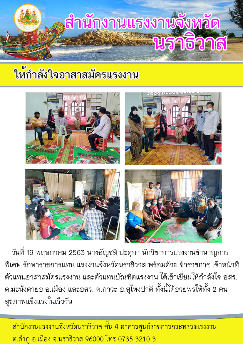 สำนักงานแรงงานจังหวัดนราธิวาส เข้าเยี่ยมให้กำลังใจอาสาสมัครแรงงาน