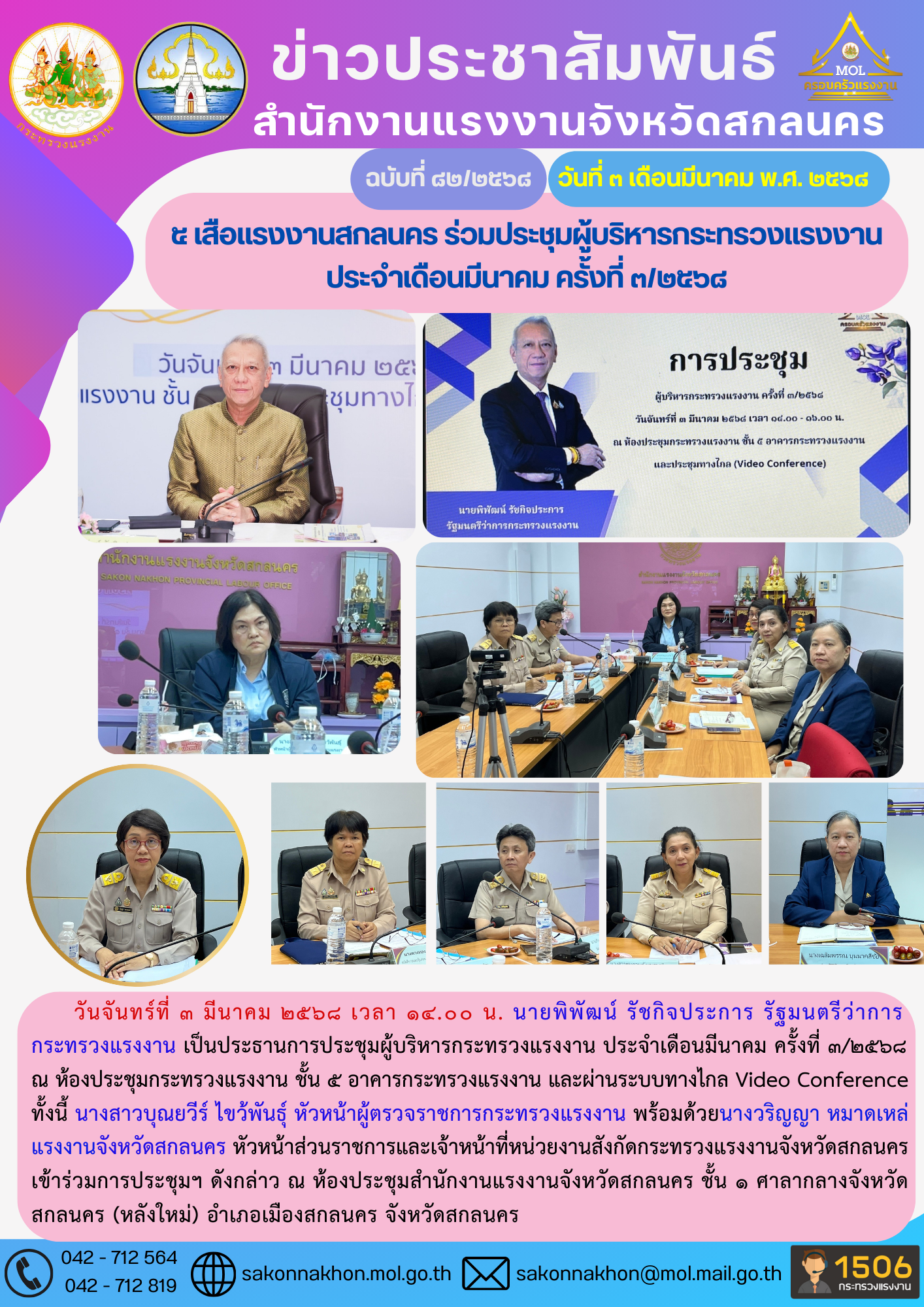 ๕ เสือแรงงานสกลนคร ร่วมประชุมผู้บริหารกระทรวงแรงงาน ประจำเดือนมีนาคม ครั้งที่ 3/2568