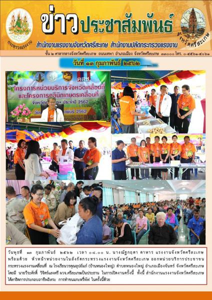 13 กุมภาพันธ์ 2562 เวลา 08.00 – 12.00 น. ร่วมออกหน่วยบริการประชาชน (กระทรวงแรงงานเคลื่อนที่)