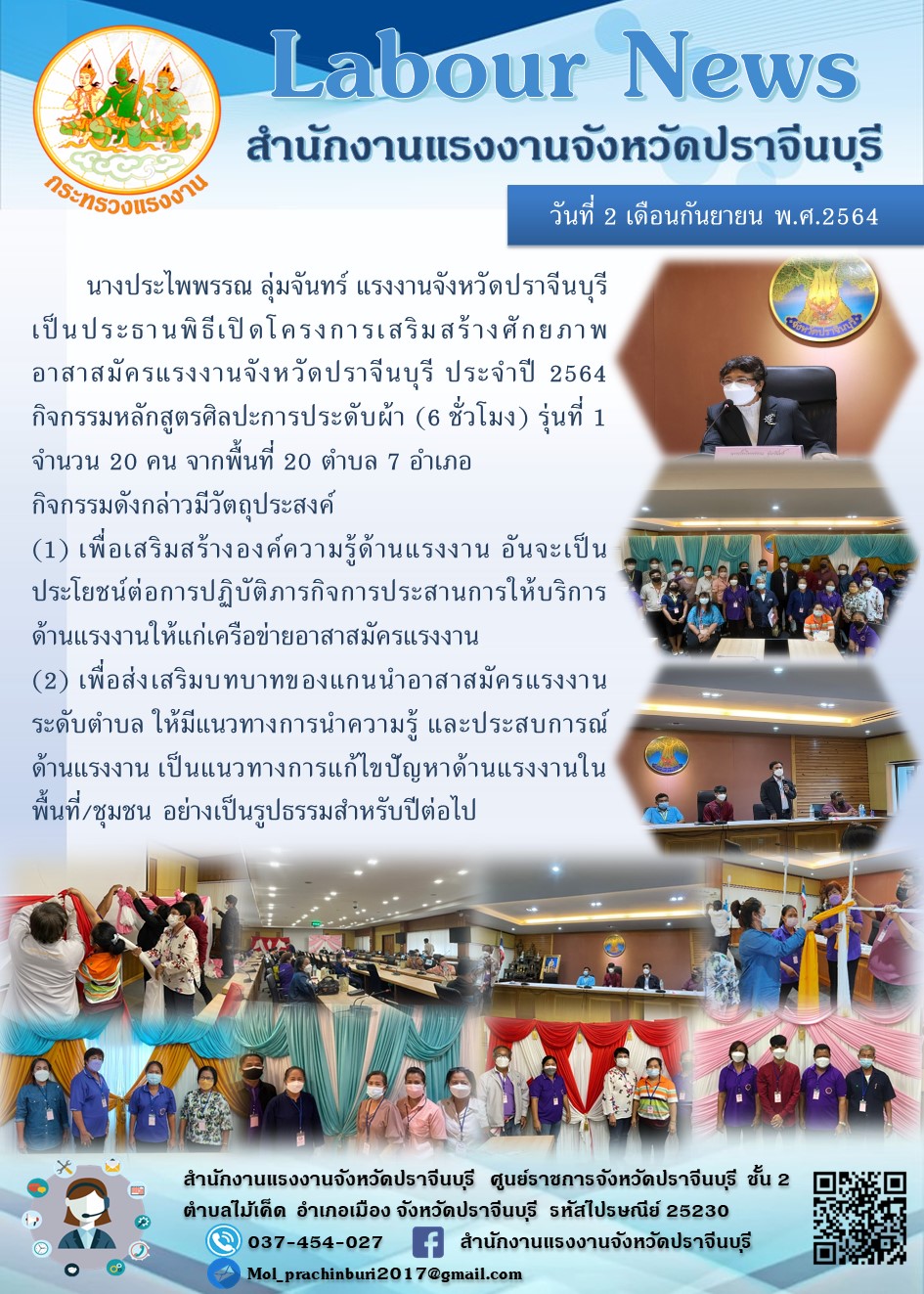 นางประไพพรรณ ลุ่มจันทร์ แรงงานจังหวัดปราจีนบุรี เป็นประธานพิธีเปิดโครงการเสริมสร้างศักยภาพอาสาสมัครแรงงานจังหวัดปราจีนบุรี ประจำปี 2564 กิจกรรมหลักสูตรศิลปะการประดับผ้า (6 ชั่วโมง) รุ่นที่ 1 จำนวน 20 คน จากพื้นที่ 20 ตำบล 7 อำเภอ