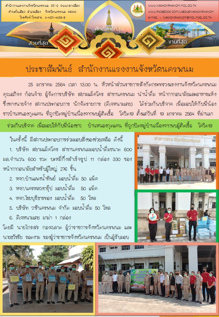 หัวหน้าส่วนราชการสังกัดกระทรวงแรงงานจังหวัดนครพนม ได้ร่วมกันบริจาค เพื่อมอบให้กับพี่น้องชาวบ้านหนองกุดแคน ที่ถูกปิดหมู่บ้านเนื่องจากพบผู้ติดเชื้อโควิด19 ตั้งแต่วันที่ 19 มกราคม 2564 ที่ผ่านมา
