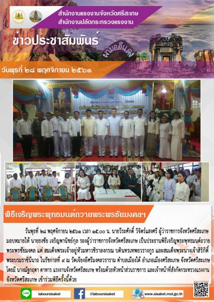 28 พฤศจิกายน 2561 เวลา 15.00 น. สำนักงานแรงงานจังหวัดศรีสะเกษ เข้าร่วมพิธีเจริญพระพุทธมนต์ถวายพระพรชัยมงคลฯ