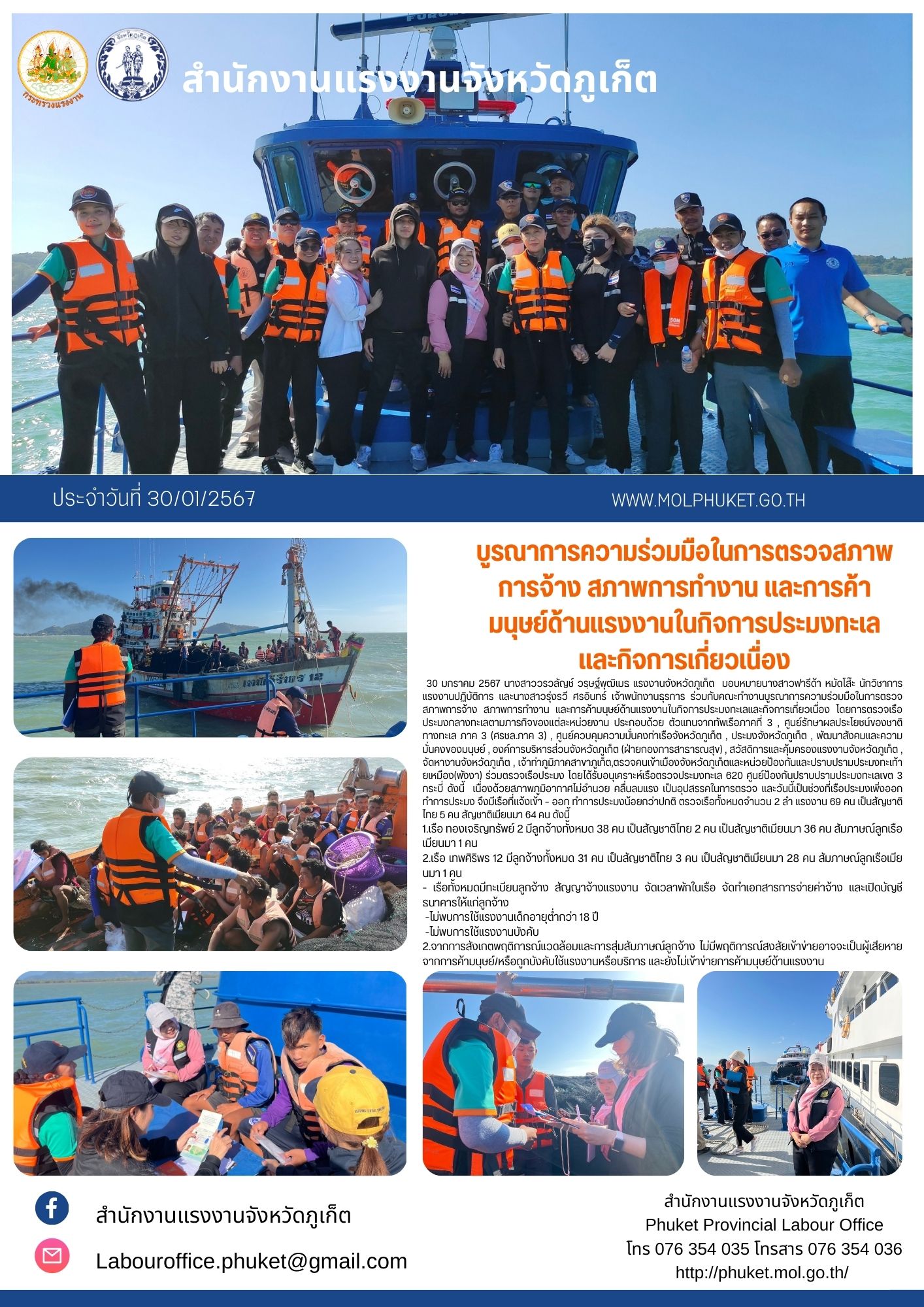 30 มกราคม 2567 นางสาววรวลัญช์ วรฺษฐ์พุฒิเมธ แรงงานจังหวัดภูเก็ต มอบหมายนางสาวฟารีด้า หมัดโส๊ะ นักวิชาการแรงงานปฏิบัติการ และนางสาวรุ่งรวี ศรอินทร์ เจ้าพนักงานธุรการ ร่วมกับคณะทำงานบูรณาการความร่วมมือในการตรวจสภาพการจ้าง สภาพการทำงาน และการค้ามนุษย์ด้านแรงงานในกิจการประมงทะเลและกิจการเกี่ยวเนื่อง