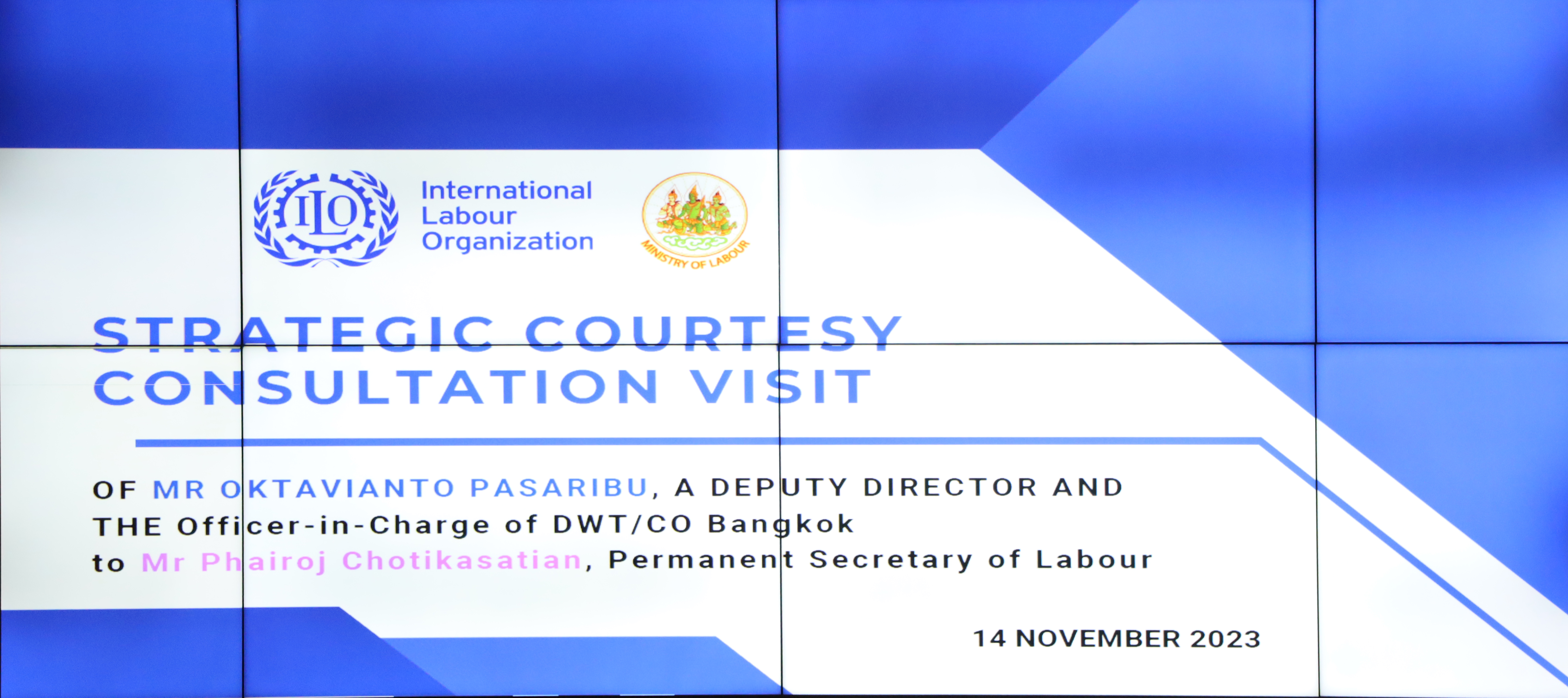 วันที่ 14 พฤศจิกายน 2566 นายไพโรจน์ โชติกเสถียร ปลัดกระทรวงแรงงาน ให้การต้อนรับ นายอ๊อคตาเวียนโต้ พาซาริบู รองผู้อำนวยการ รักษาการผู้อำนวยการสำนักงานแรงงานระหว่างประเทศประจำประเทศไทย กัมพูชา และ สปป. ลาว ในโอกาสเยี่ยมเยียน พร้อมหารือเชิงนโยบายระหว่างกระทรวงแรงงาน และสำนักงานแรงงานระหว่างประเทศ ประจำประเทศไทย กัมพูชา และ สปป. ลาว โดยมี ผู้บริหารระดับสูงกระทรวงแรงงาน ร่วมให้การต้อนรับ ณ ห้องประชุมประสงค์ รณะนันทน์ ชั้น 5 อาคารกระทรวงแรงงาน