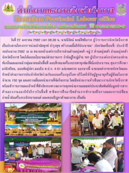5เสือแรงงานจังหวัดบึงกาฬ ร่วมโครงการ "หน่วยบำบัดทุกข์ บำรุงสุข สร้างรอยยิ้มให้ประชาชน ประจำปีงบประมาณ พ.ศ.2562