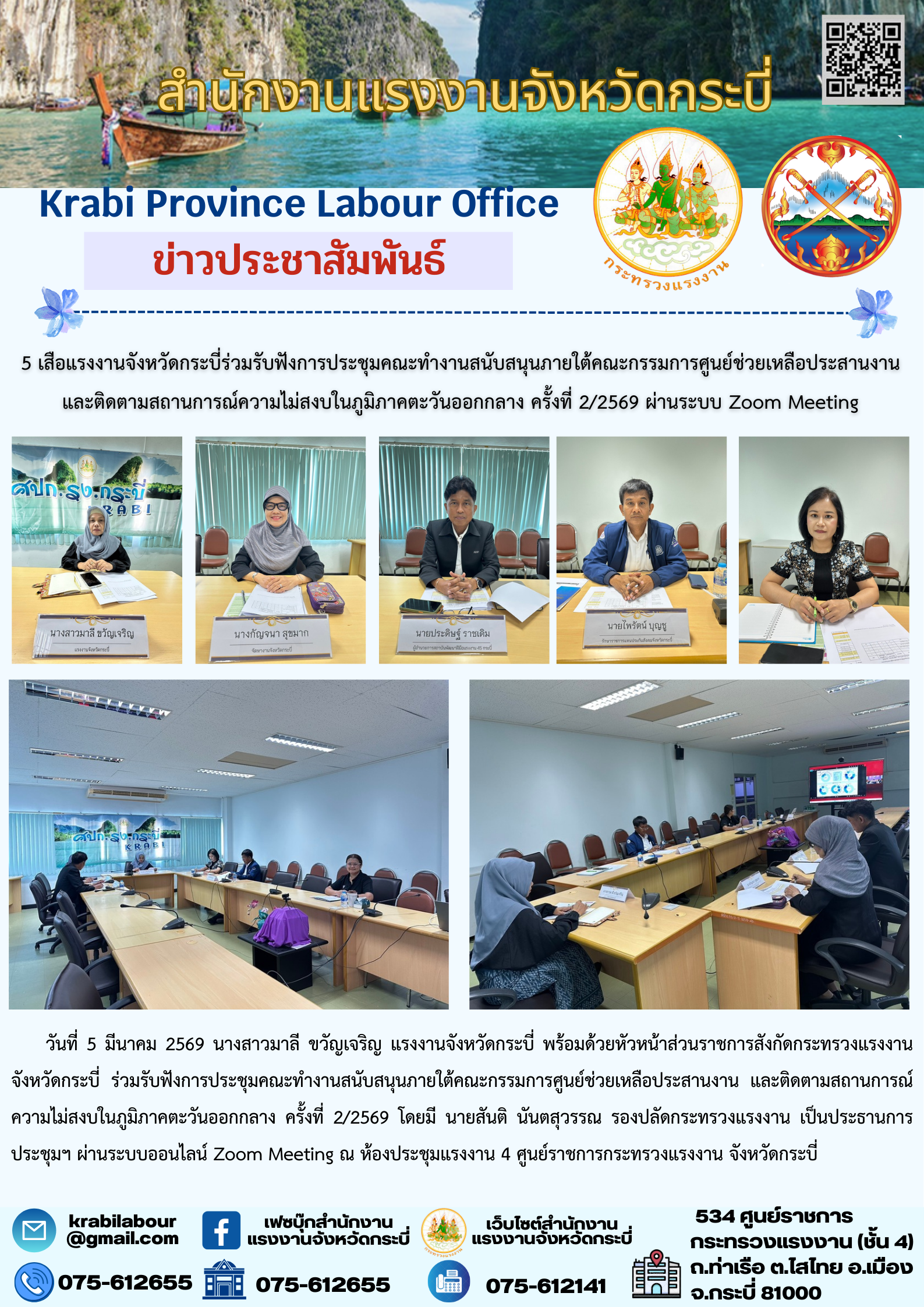 5 เสือแรงงานจังหวัดกระบี่ร่วมรับฟังการประชุมคณะทำงานสนับสนุนภายใต้คณะกรรมการศูนย์ช่วยเหลือประสานงาน และติดตามสถานการณ์ความไม่สงบในภูมิภาคตะวันออกกลาง ครั้งที่ 2/2569 ผ่านระบบ Zoom Meeting