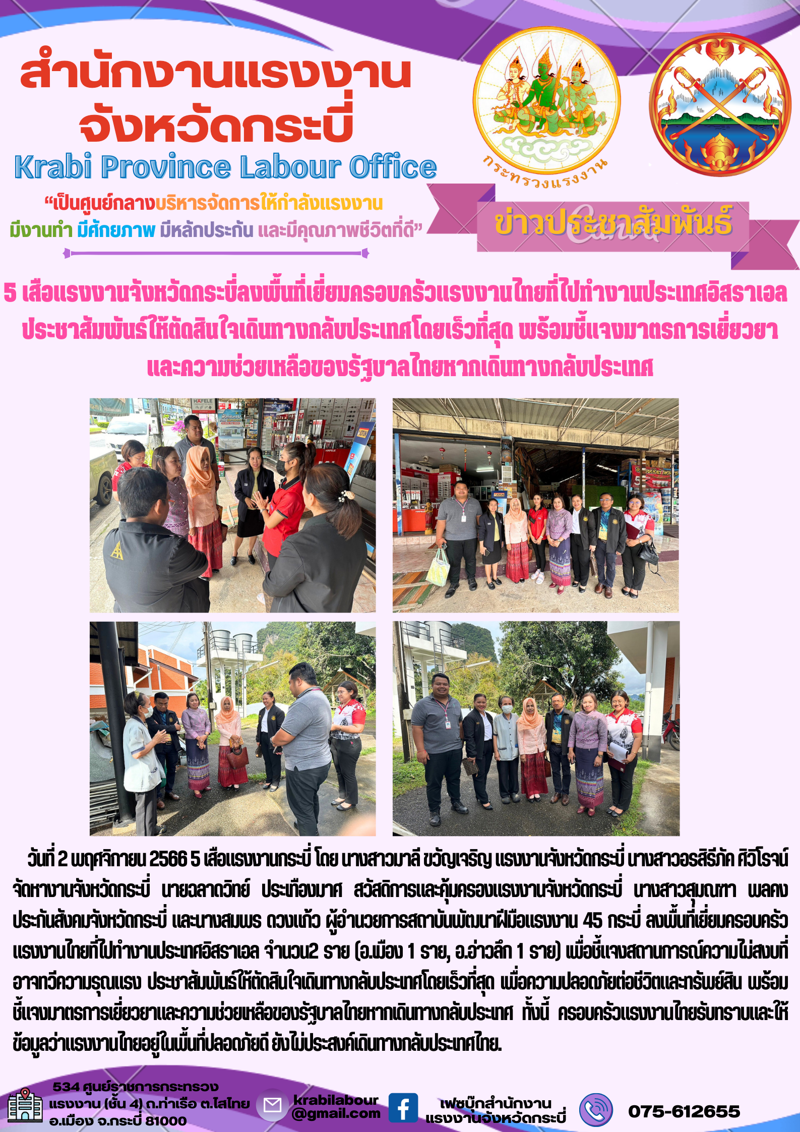 สรจ.กระบี่ ลงพื้นที่เยี่ยมครอบครัวแรงงานไทยที่ไปทำงานประเทศอิสราเอล ประชาสัมพันธ์ให้ตัดสินใจเดินทางกลับประเทศโดยเร็วที่สุด พร้อมชี้แจงมาตรการเยี่ยวยา และความช่วยเหลือของรัฐบาลไทยหากเดินทางกลับประเทศ