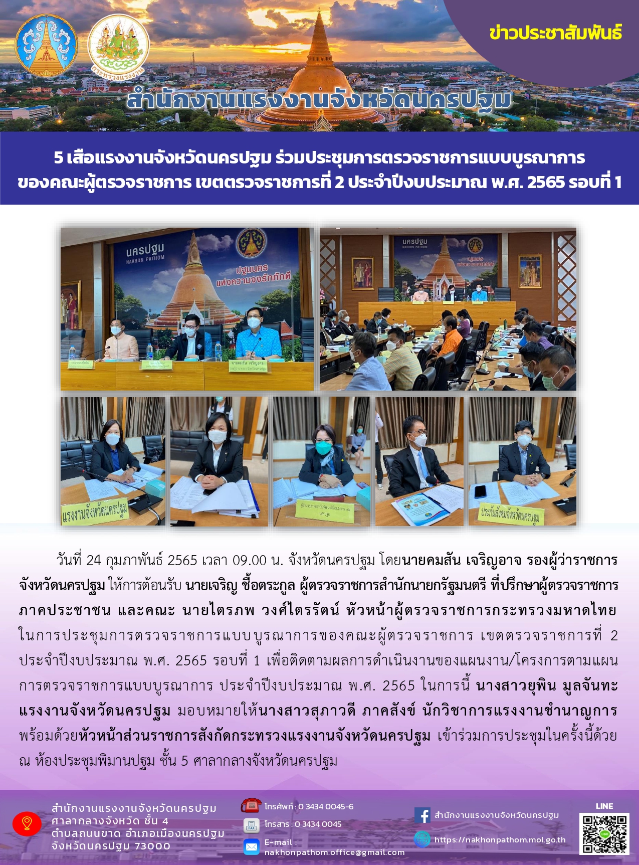 5 เสือแรงงานจังหวัดนครปฐม ร่วมประชุมการตรวจราชการแบบบูรณาการของคณะผู้ตรวจราชการ เขตตรวจราชการที่ 2 ประจำปีงบประมาณ พ.ศ. 2565 รอบที่ 1