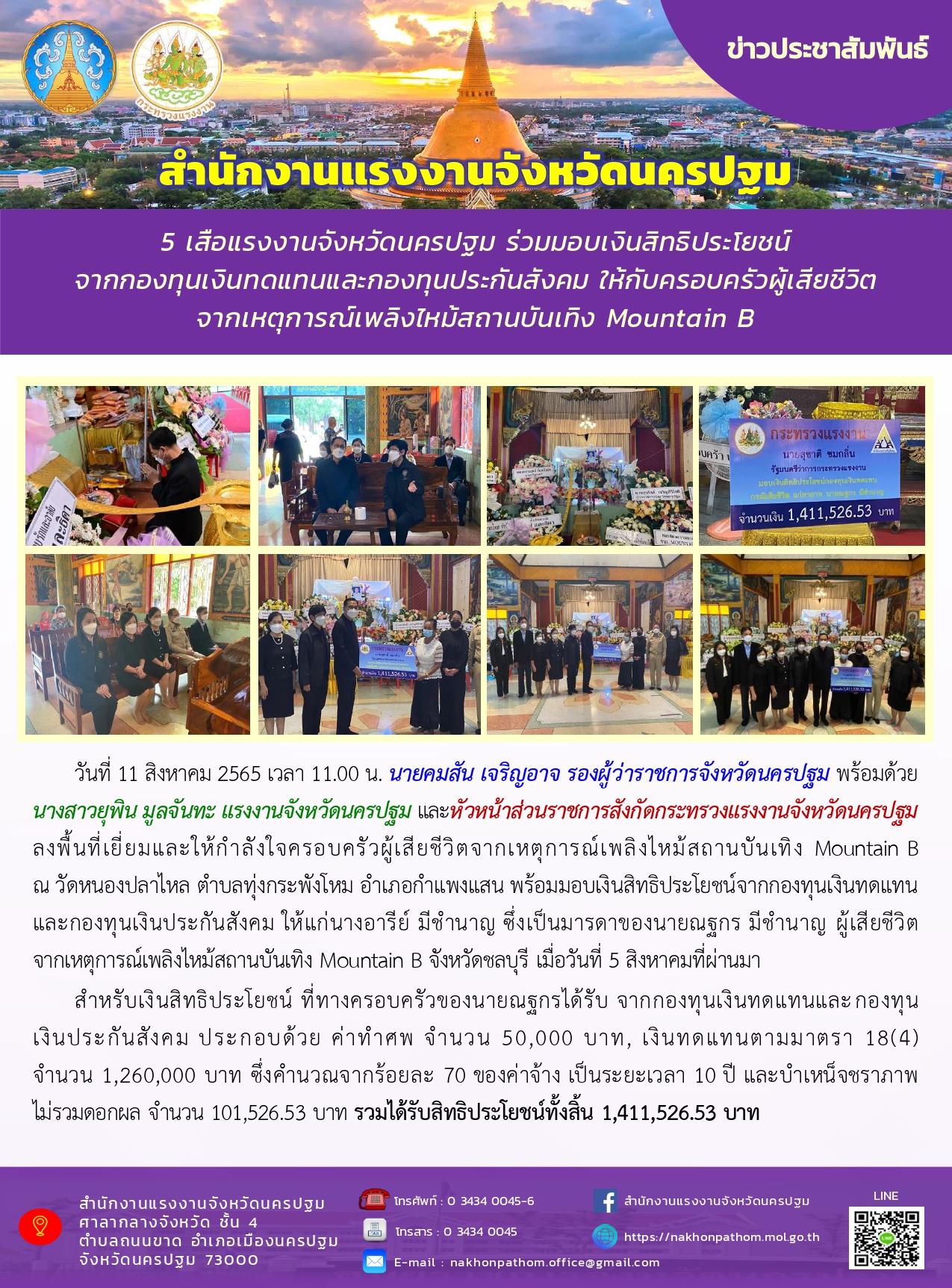 5 เสือแรงงานจังหวัดนครปฐม ร่วมมอบเงินสิทธิประโยชน์จากกองทุนเงินทดแทน และกองทุนประกันสังคม ให้กับครอบครัวผู้เสียชีวิตจากเหตุการณ์เพลิงไหม้สถานบันเทิง Mountain B