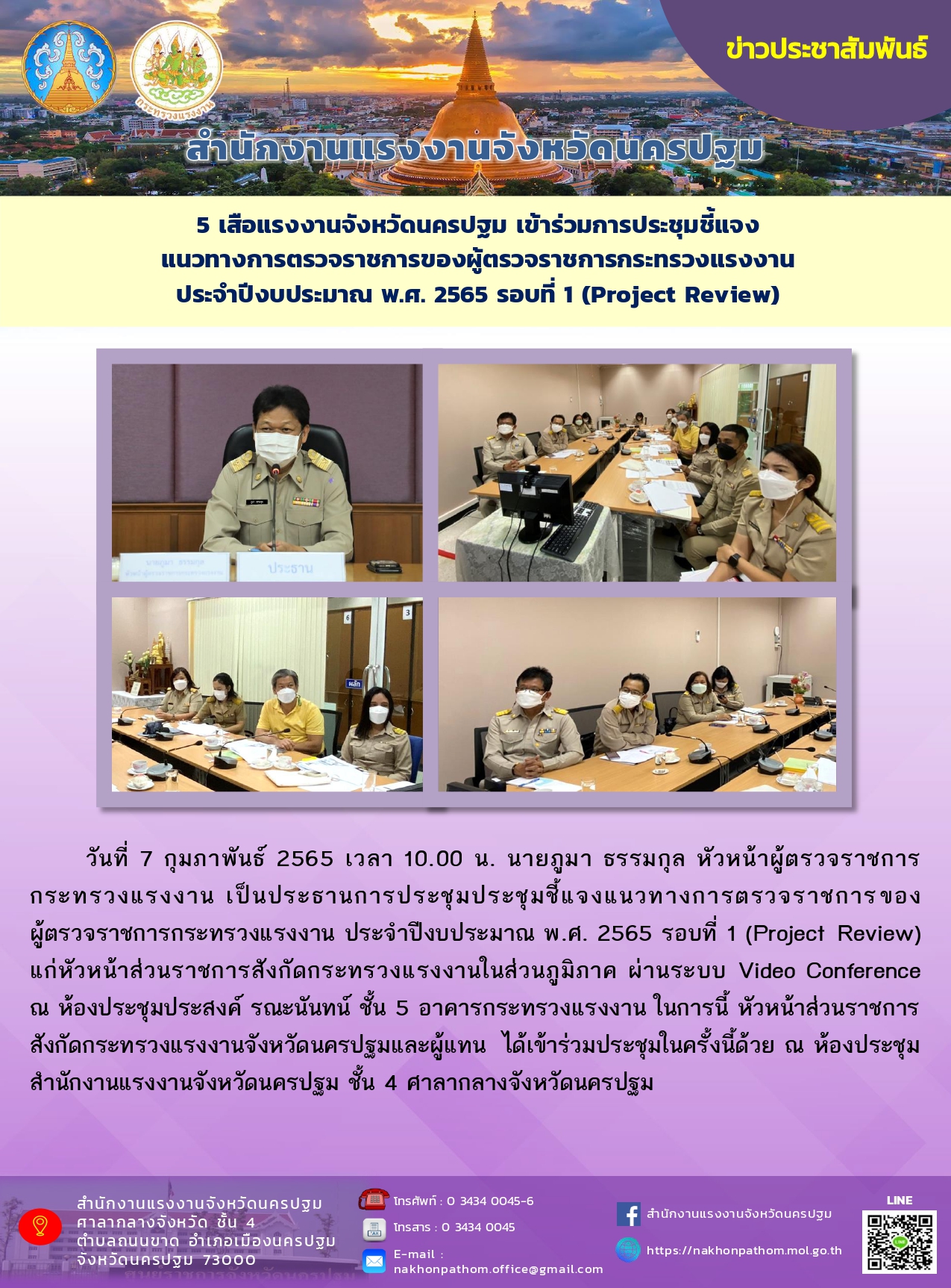 5 เสือแรงงานจังหวัดนครปฐม เข้าร่วมการประชุมชี้แจงแนวทางการตรวจราชการของผู้ตรวจราชการกระทรวงแรงงาน ประจำปีงบประมาณ พ.ศ. 2565 รอบที่ 1 (Project Review)