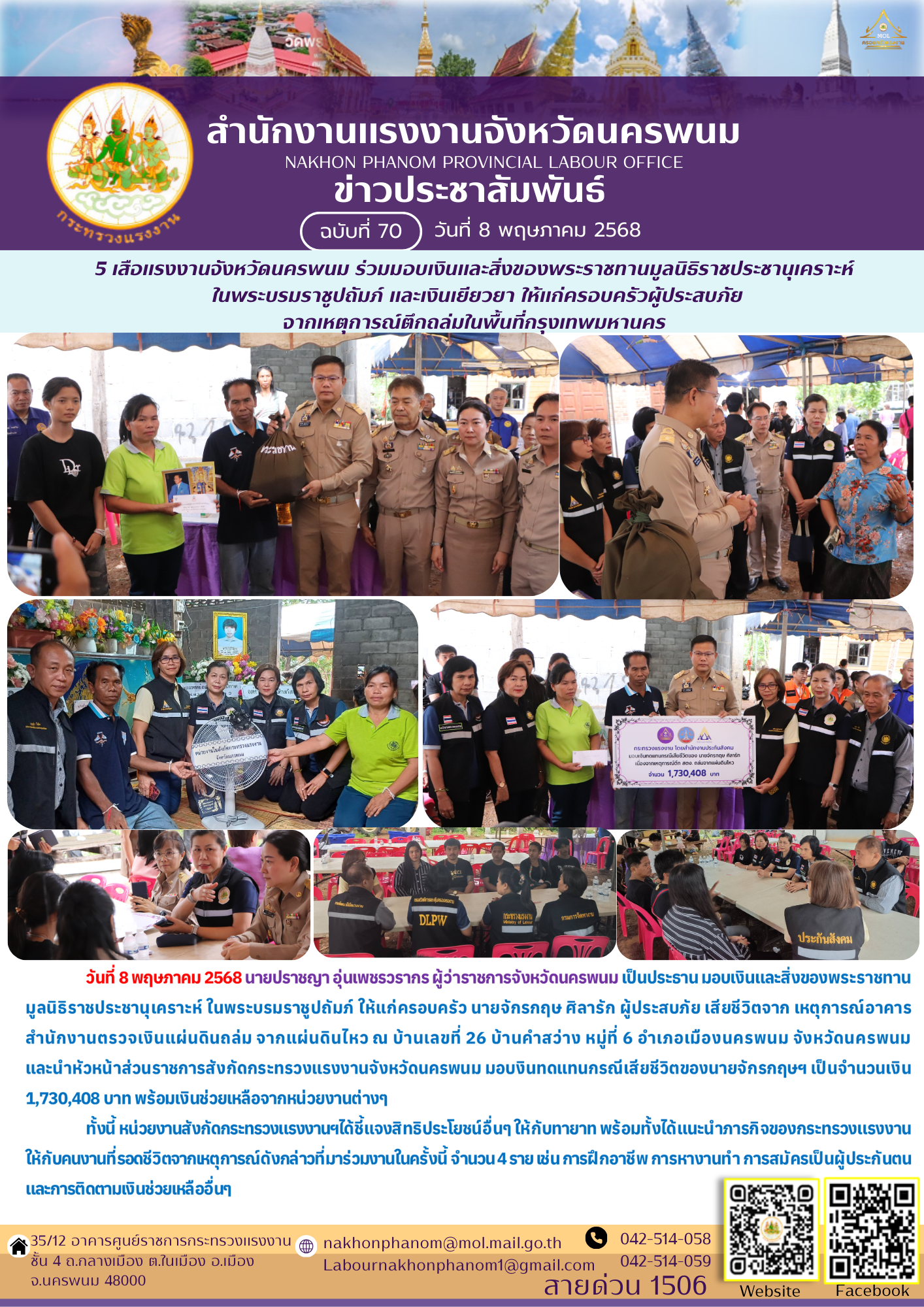 5 เสือแรงงานจังหวัดนครพนม ร่วมมอบเงินและสิ่งของพระราชทานมูลนิธิราชประชานุเคราะห์ ในพระบรมราชูปถัมภ์ และเงินเยียวยา ให้แก่ครอบครัวผู้ประสบภัย จากเหตุการณ์ตึกถล่มในพื้นที่กรุงเทพมหานคร