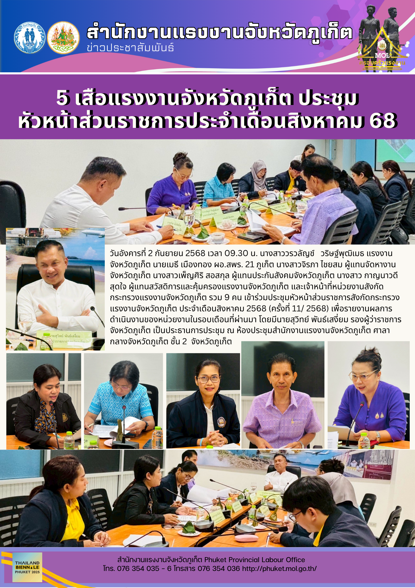 5 เสือแรงงานจังหวัดภูเก็ต ประชุม หัวหน้าส่วนราชการประจำเดือนสิงหาคม 68