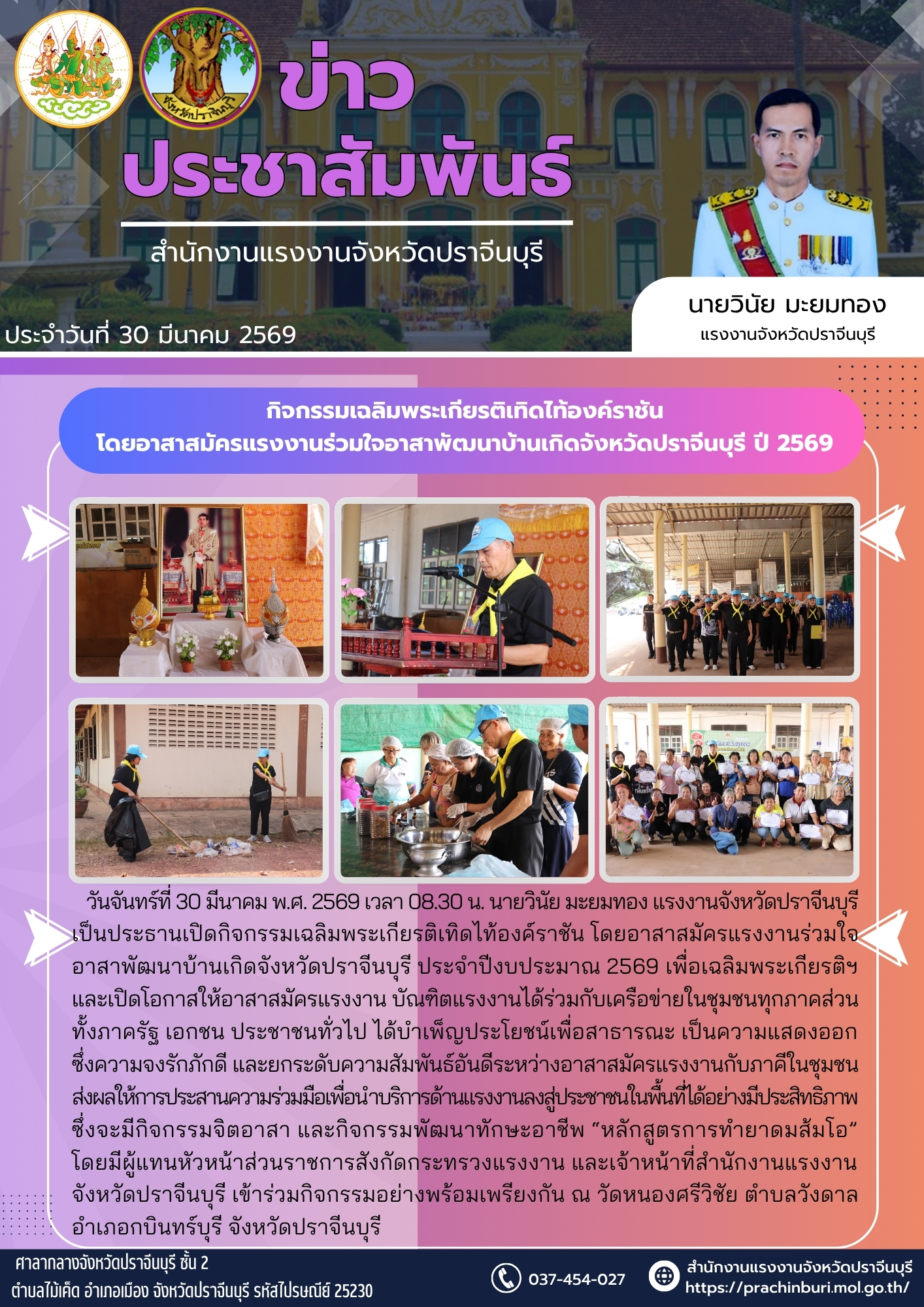 กิจกรรมเฉลิมพระเกียรติเทิดไท้องค์ราชัน โดยอาสาสมัครแรงงานร่วมใจอาสาพัฒนาบ้านเกิดจังหวัดปราจีนบุรี ปี 2569