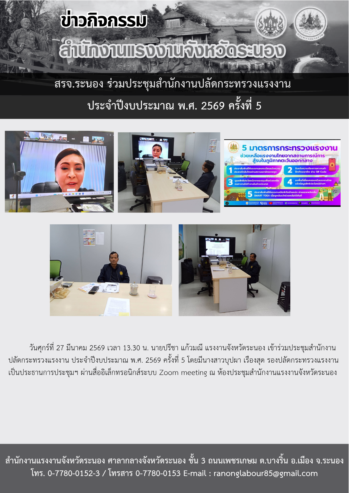 สรจ.ระนอง ร่วมประชุมสำนักงานปลัดกระทรวงแรงงาน ประจำปีงบประมาณ พ.ศ. 2569 ครั้งที่ 5