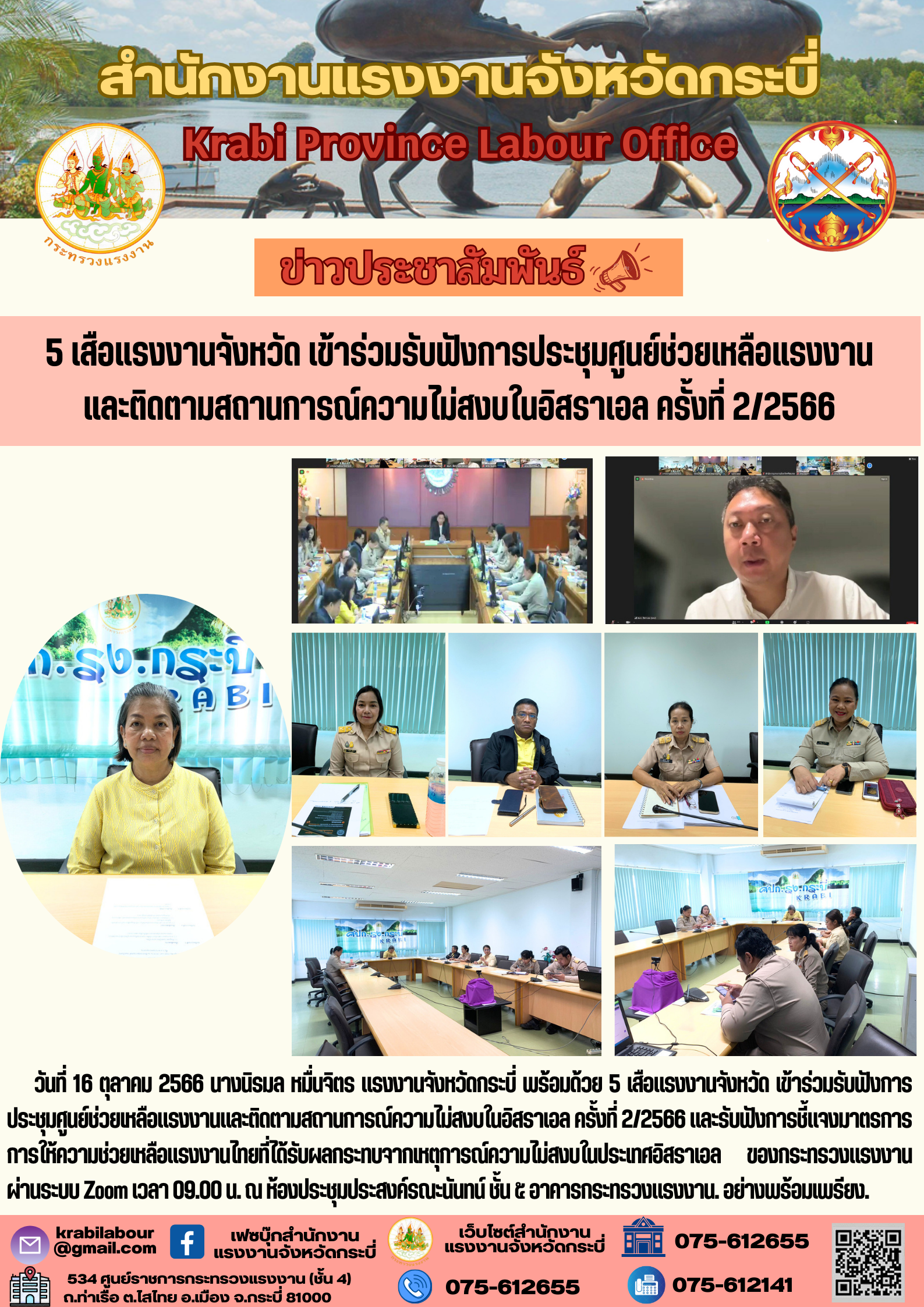 สรจ.กระบี่ เข้าร่วมรับฟังการประชุมศูนย์ช่วยเหลือแรงงาน และติดตามสถานการณ์ความไม่สงบในอิสราเอล ครั้งที่ 2/2566