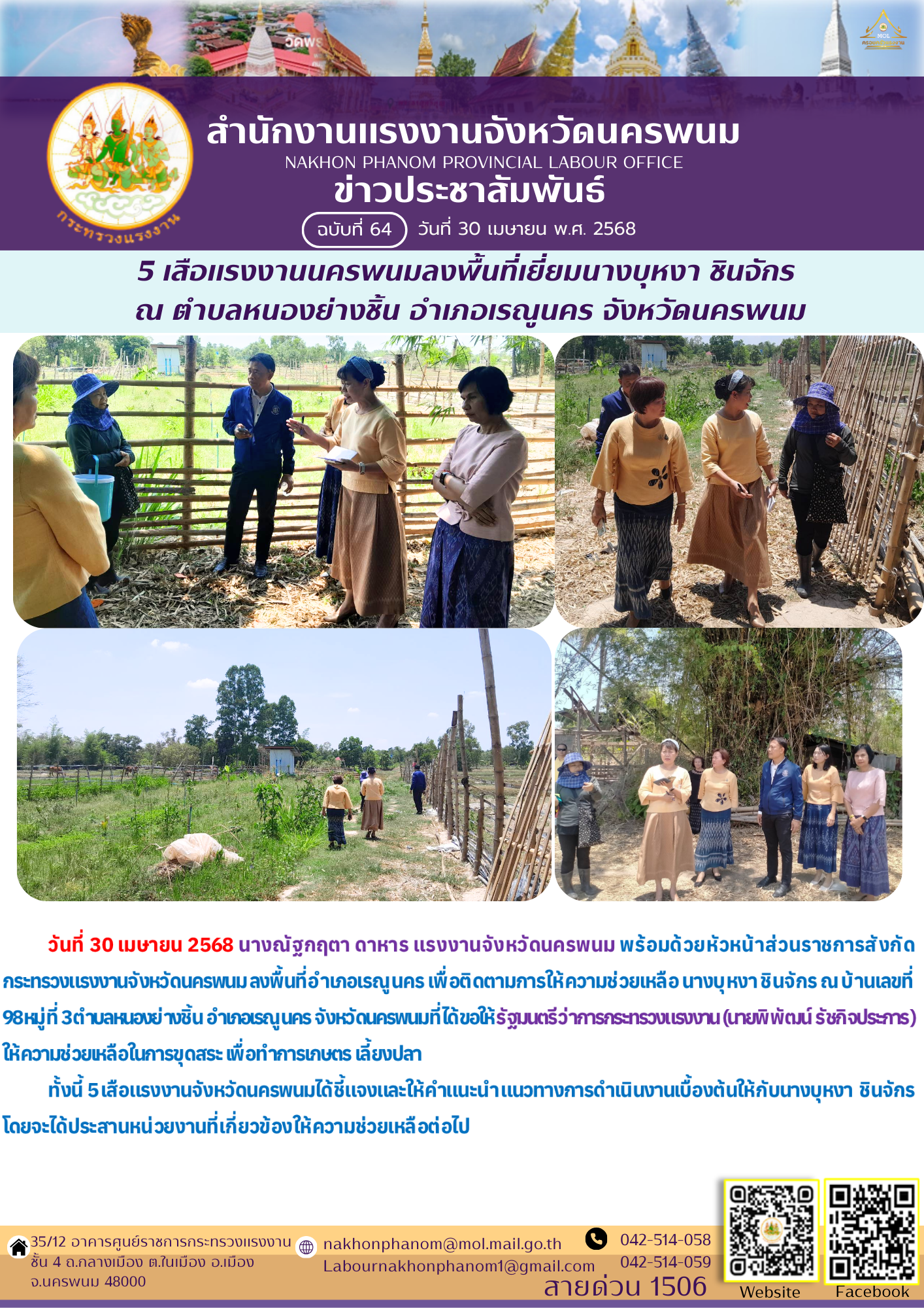 5 เสือแรงงานนครพนมลงพื้นที่เยี่ยมนางบุหงา ชินจักร ณ ตำบลหนองย่างชิ้น อำเภอเรณูนคร จังหวัดนครพนม