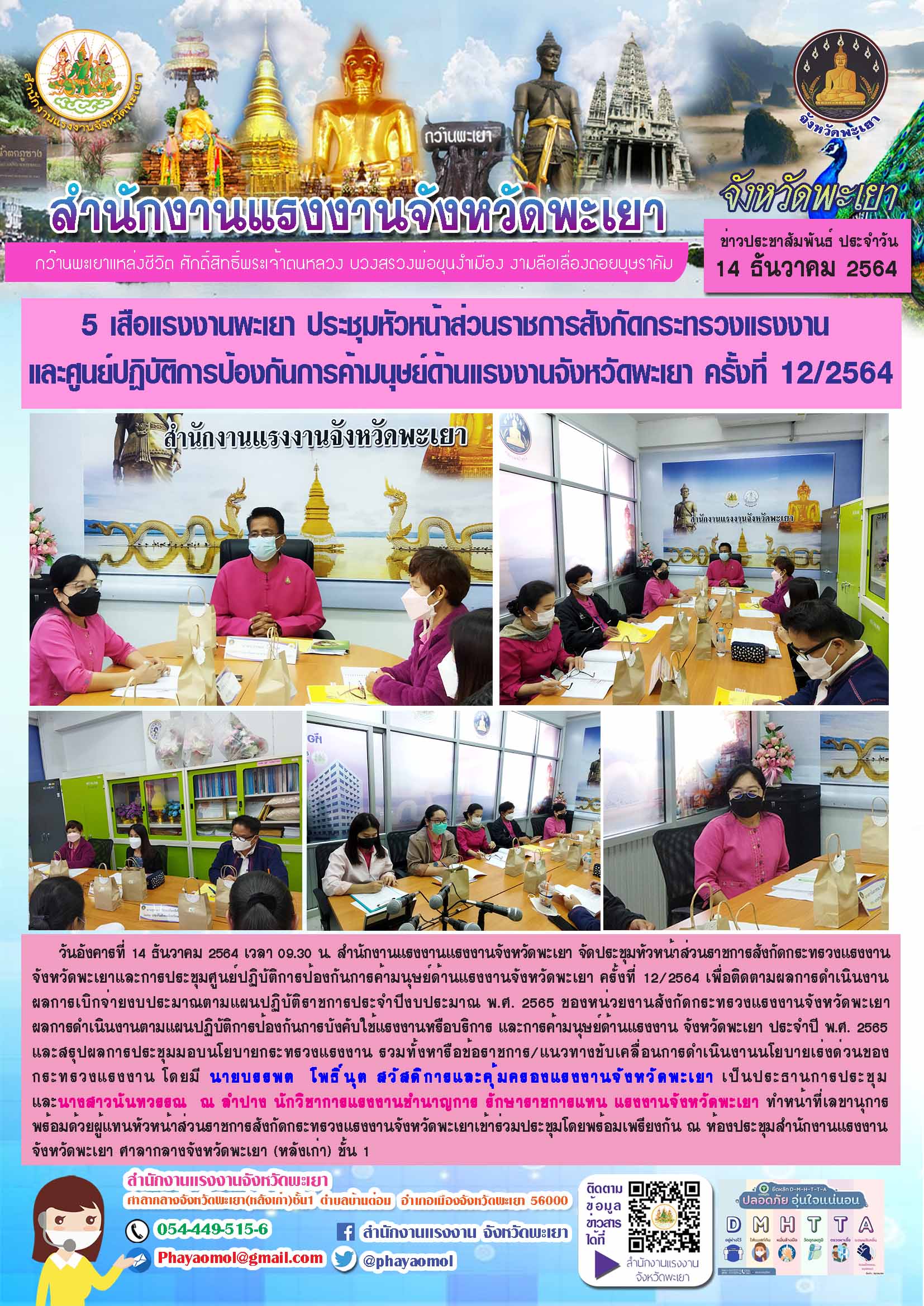 5 เสือแรงงานพะเยา ประชุมหัวหน้าส่วนราชการสังกัดกระทรวงแรงงานและศูนย์ปฏิบัติการป้องกันการค้ามนุษย์ด้านแรงงานจังหวัดพะเยา ครั้งที่ 12/2564 วันอังคารที่ 14 ธันวาคม 2564 เวลา 09.30 น. สำนักงานแรงงานแรงงานจังหวัดพะเยา จัดประชุมหัวหน้าส่วนราชการสังกัดกระทรวงแรงงาน จังหวัดพะเยาและการประชุมศูนย์ปฏิบัติการป้องกันการค้ามนุษย์ด้านแรงงานจังหวัดพะเยา ครั้งที่ 12/2564 เพื่อติดตามผลการดำเนินงานผลการเบิกจ่ายงบประมาณตามแผนปฏิบัติราชการประจำปีงบประมาณ พ.ศ. 2565 ของหน่วยงานสังกัดกระทรวงแรงงานจังหวัดพะเยา ผลการดำเนินงานตามแผนปฏิบัติการป้องกันการบังคับใช้แรงงานหรือบริการ และการค้ามนุษย์ด้านแรงงาน จังหวัดพะเยา ประจำปี พ.ศ. 2565 และสรุปผลการประชุมมอบนโยบายกระทรวงแรงงาน รวมทั้งหารือข้อราชการ/แนวทางขับเคลื่อนการดำเนินงานนโยบายเร่งด่วนของกระทรวงแรงงาน โดยมี นายบรรพต โพธิ์นุต สวัสดิการและคุ้มครองแรงงานจังหวัดพะเยา เป็นประธานการประชุม และนางสาวนันทวรรณ ณ ลำปาง นักวิชาการแรงงานชำนาญการ รักษาราชการแทน แรงงานจังหวัดพะเยา ทำหน้าที่เลขานุการ พร้อมด้วยผู้แทนหัวหน้าส่วนราชการสังกัดกระทรวงแรงงานจังหวัดพะเยาเข้าร่วมประชุมโดยพร้อมเพรียงกัน ณ ห้องประชุมสำนักงานแรงงานจังหวัดพะเยา ศาลากลางจังหวัดพะเยา (หลังเก่า) ชั้น 1