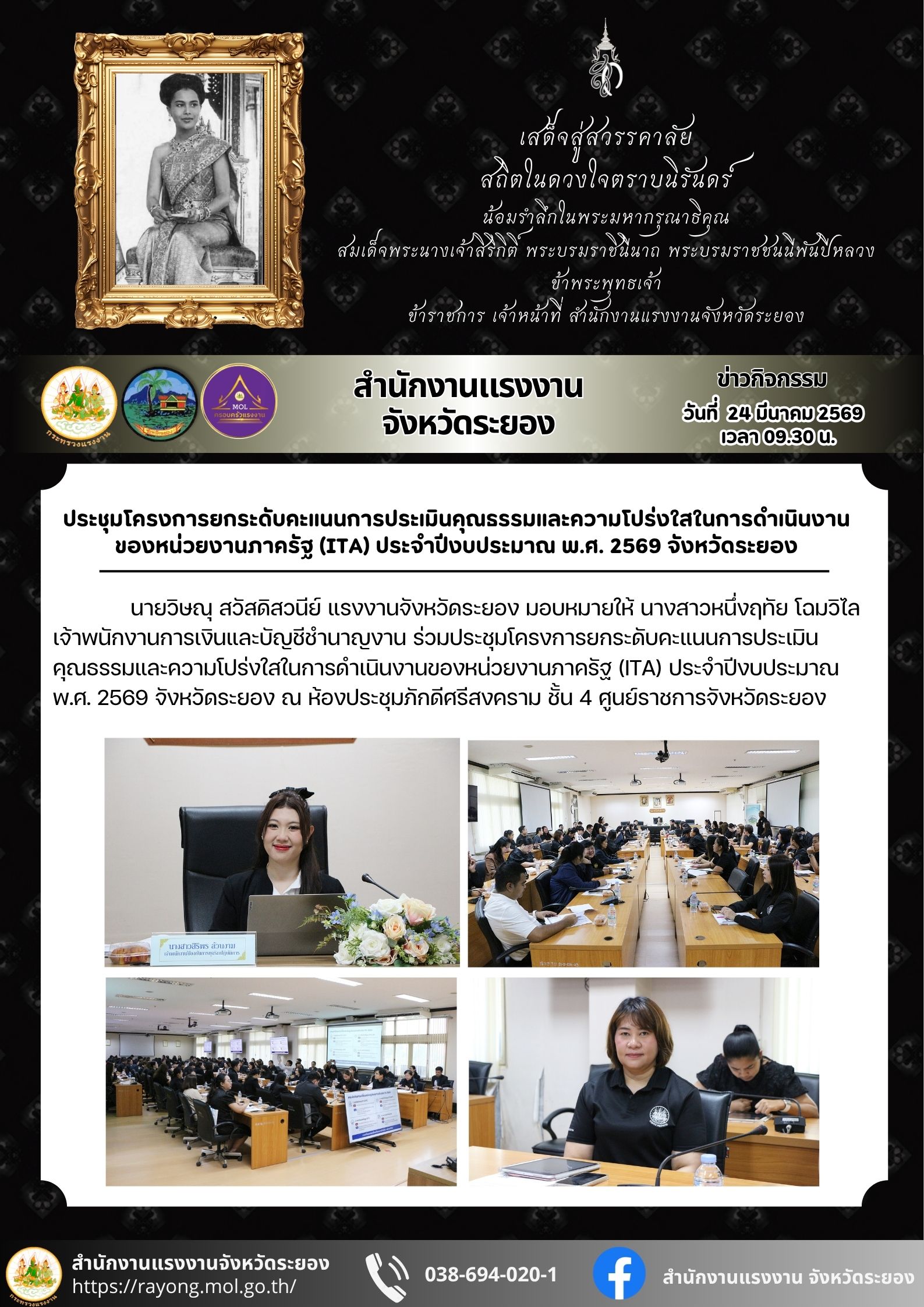 แรงงานจังหวัดระยอง มอบหมายให้ นางสาวหนึ่งฤทัย โฉมวิไล เจ้าพนักงานการเงินและบัญชีชำนาญงาน ร่วมประชุมโครงการยกระดับคะแนนการประเมินคุณธรรมและความโปร่งใสในการดำเนินงานของหน่วยงานภาครัฐ (ITA) ประจำปีงบประมาณ พ.ศ. 2569 จังหวัดระยอง