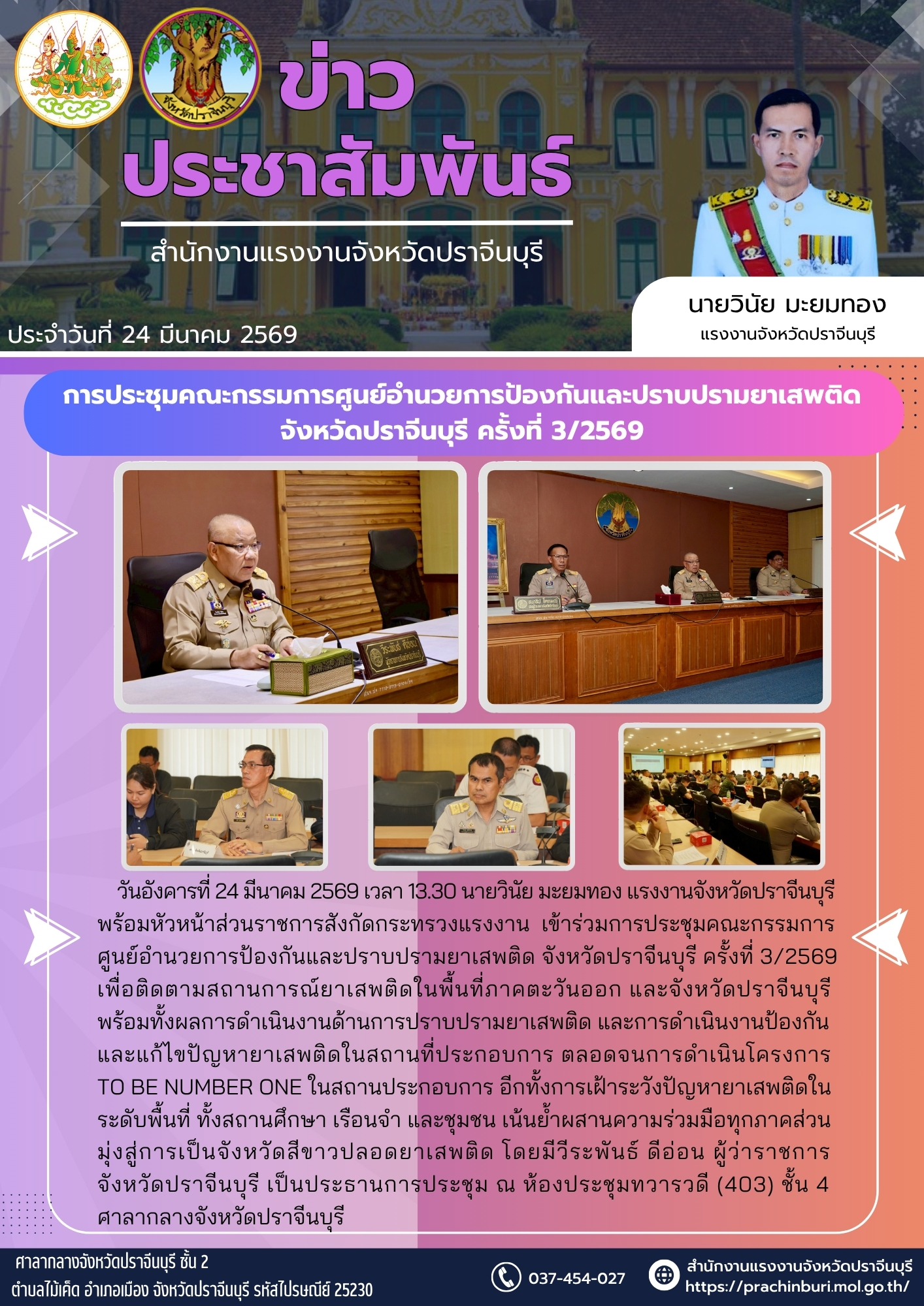 การประชุมคณะกรรมการศูนย์อำนวยการป้องกันและปราบปรามยาเสพติด จังหวัดปราจีนบุรี ครั้งที่ 3/2569