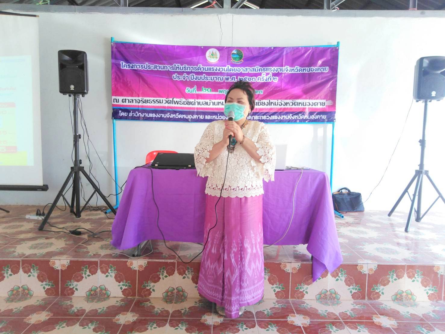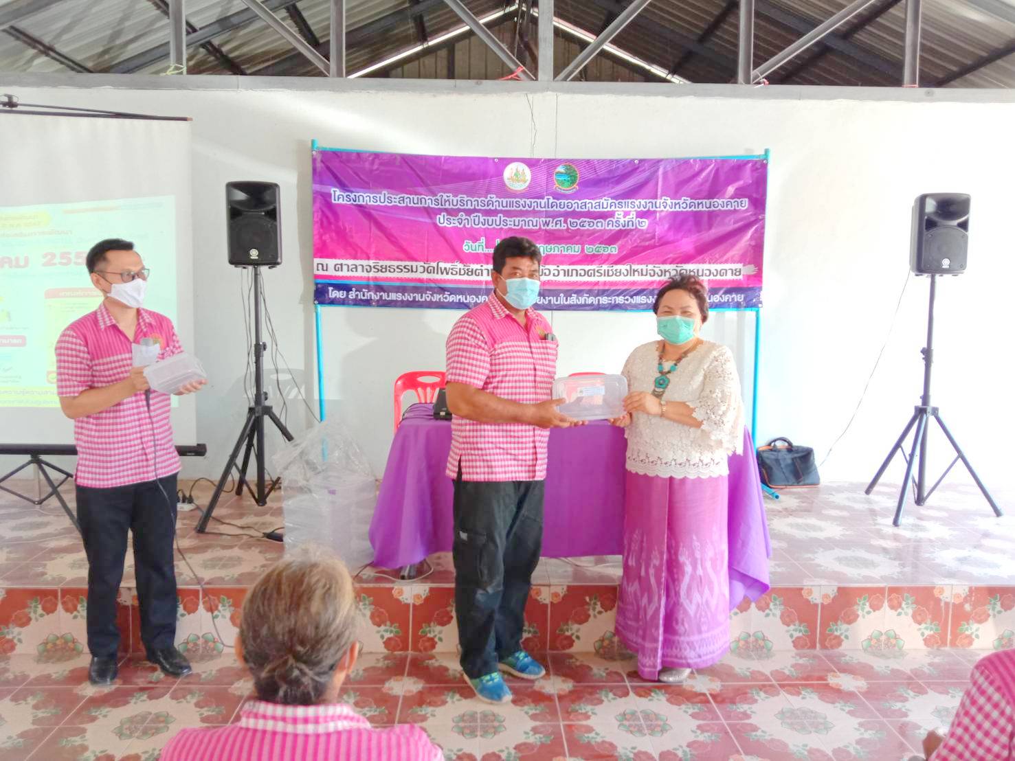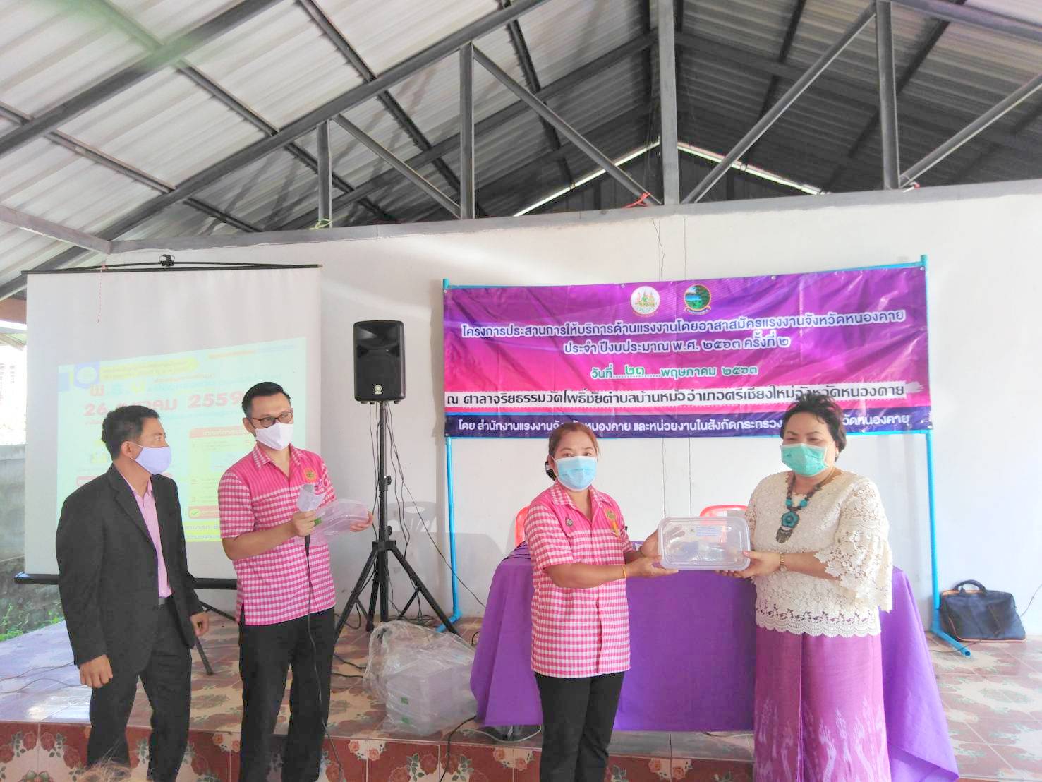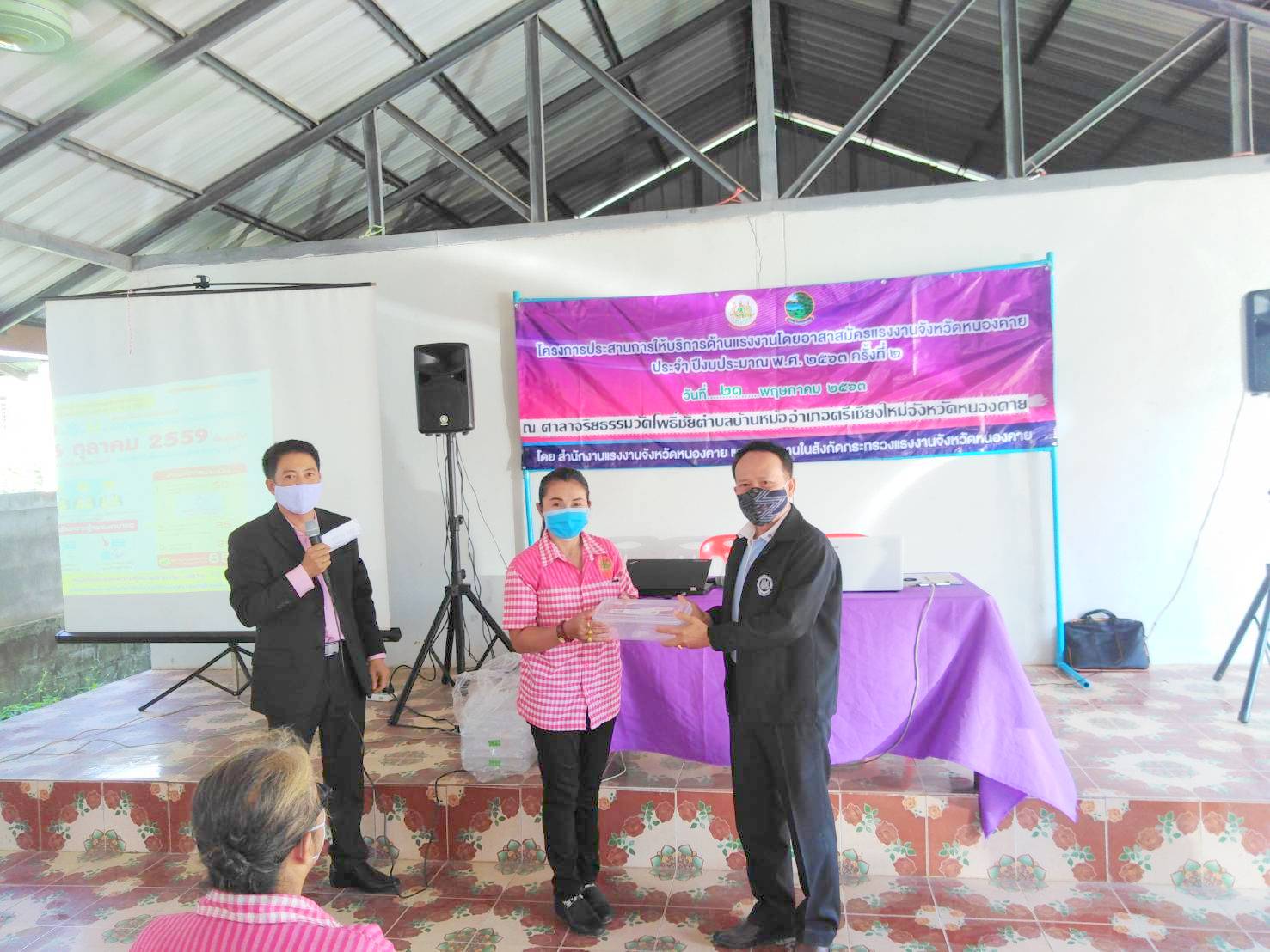 วันที่ 21 พฤษภาคม 2560 เวลา 09.00 น. นางวรรณกานต์ ขาวลาภ แรงงานจังหวัดหนองคาย พร้อมด้วยนายสมศักดิ์ เพ็งธรรม ผู้อำนวยการสำนักงานพัฒนาฝีมือแรงงานหนองคาย และพี่เลี้ยงอาสาสมัครแรงงานจังหวัดหนองคาย ออกพื้นที่ติดตามผลการดำเนินงานของอาสาสมัครแรงงานในพื้นที่อำเภอท่าบ่อ ศรีเชียงใหม่ โพธิ์ตาก และอำเภอสังคม พร้อมทั้งทบทวนองค์ความรู้ของหน่วยงานในสังกัดกระทรวงแรงงาน และถ่ายทอดนโยบายของผู้บริหารของกระทรวงแรงงาน ให้แก่อาสาสมัครแรงงานจังหวัดหนองคาย เพื่อใช้เป็นแนวทางในการให้บริการด้านแรงงานแก่ประชาชนในพื้นที่ ตามโครงการประสานการให้บริการด้านแรงงานโดยอาสาสมัครแรงงานจังหวัดหนองคาย ประจำปีงบประมาณ พ.ศ. 2563 ครั้งที่ 2 ณ ศาลาจริยธรรม วัดโพธิ์ชัย ตำบลบ้านหม้อ อำเภอศรีเชียงใหม่ จังหวัดหนองคาย