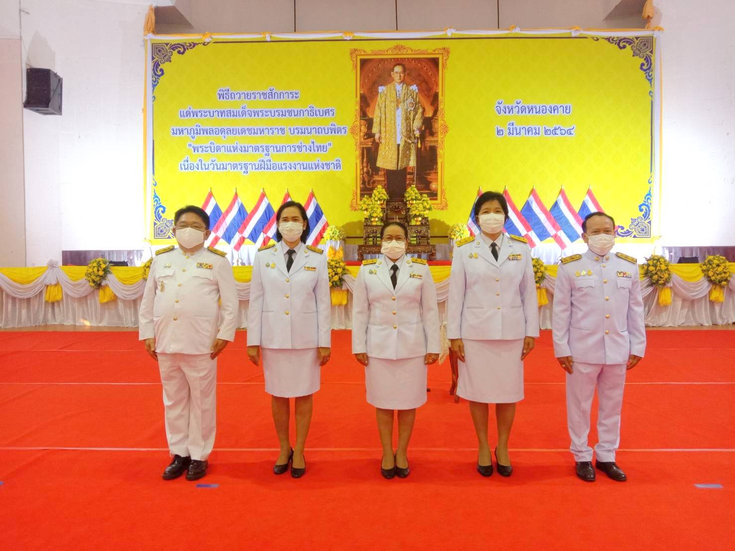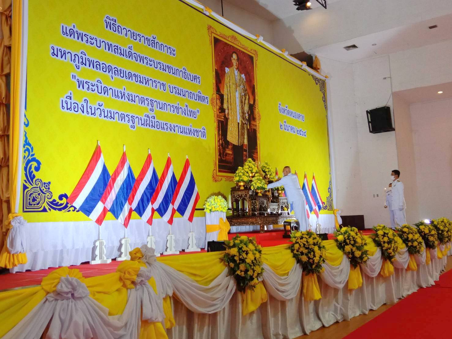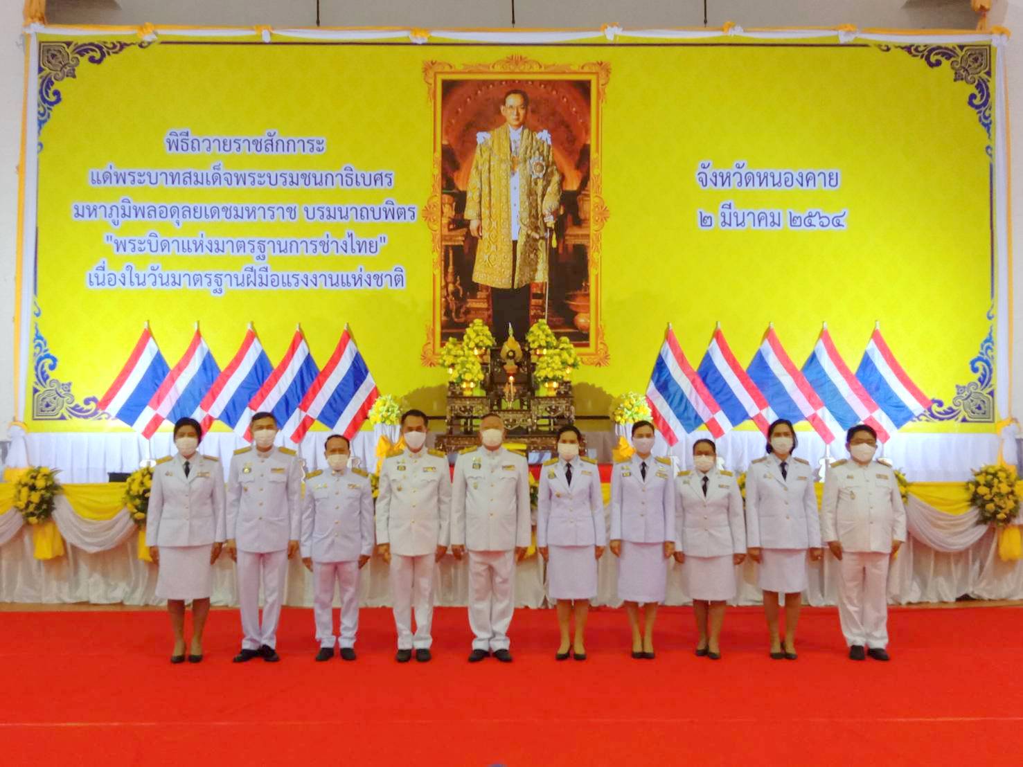 วันที่ 2 มีนาคม 2564 เวลา 08.00 น. นางสมหมาย เทียมกัน แรงงานจังหวัดหนองคาย พร้อมด้วยหัวหน้าส่วนราชการสังกัดกระทรวงแรงงานจังหวัดหนองคาย ร่วมพิธีถวายราชสักการะ เนื่องในวันมาตรฐานฝีมือแรงงานแห่งชาติ ประจำปีพุทธศักราช 2564 ณ หอประชุมประจักษศิลปาคม ศาลากลางจังหวัดหนองคาย อำเภอเมือง จังหวัดหนองคาย ในการนี้ นายประเสริฐ ลือชาธนานนท์ ผู้ว่าราชการจังหวัดหนองคาย เป็นประธานในพิธี โดยมีสำนักงานพัฒนาฝีมือแรงงานหนองคาย เป็นเจ้าภาพในการจัดงานดังกล่าว