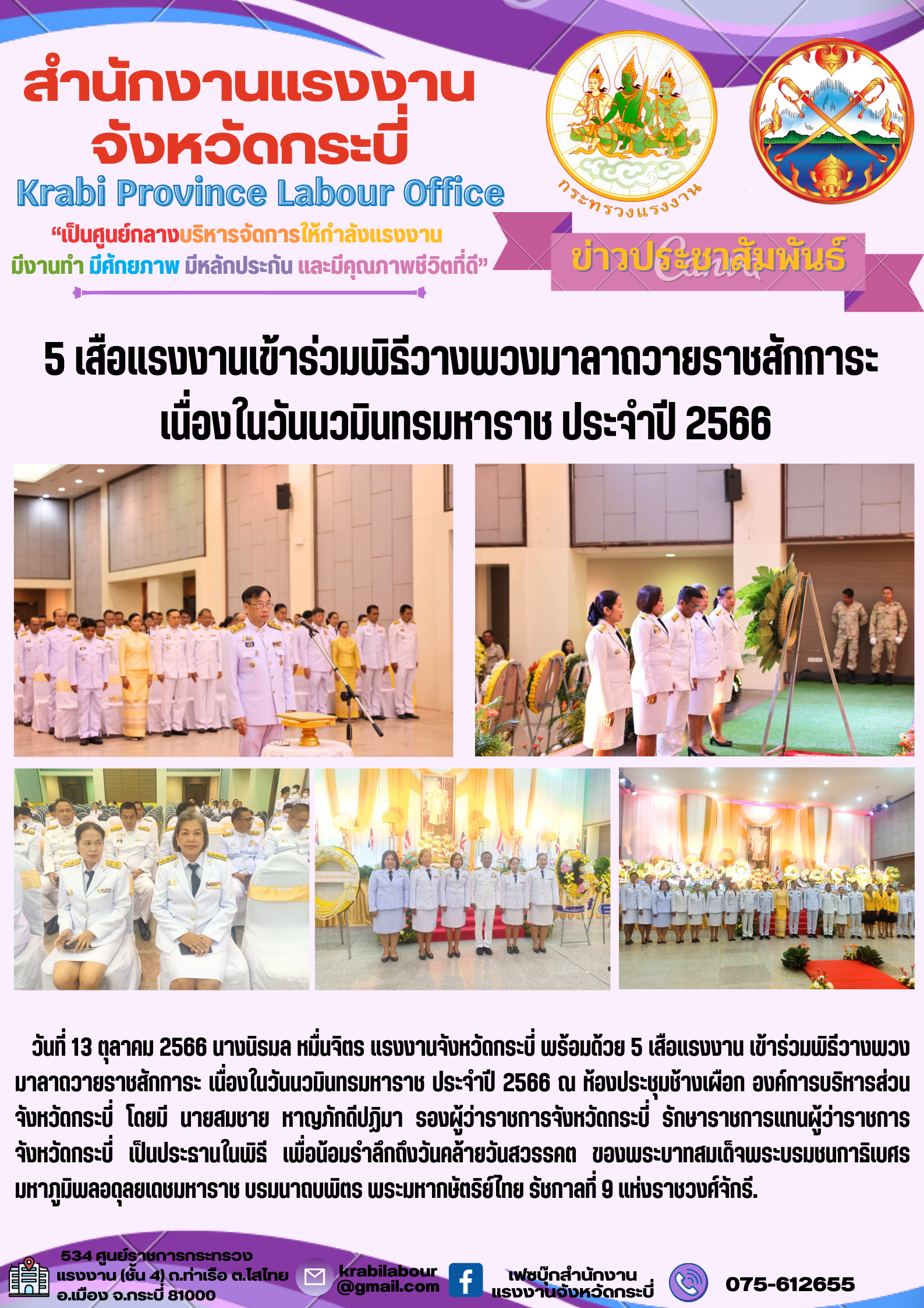 สรจ.กระบี่ เข้าร่วมพิธีวางพวงมาลาถวายราชสักการะ เนื่องในวันนวมินทรมหาราช ประจำปี 2566