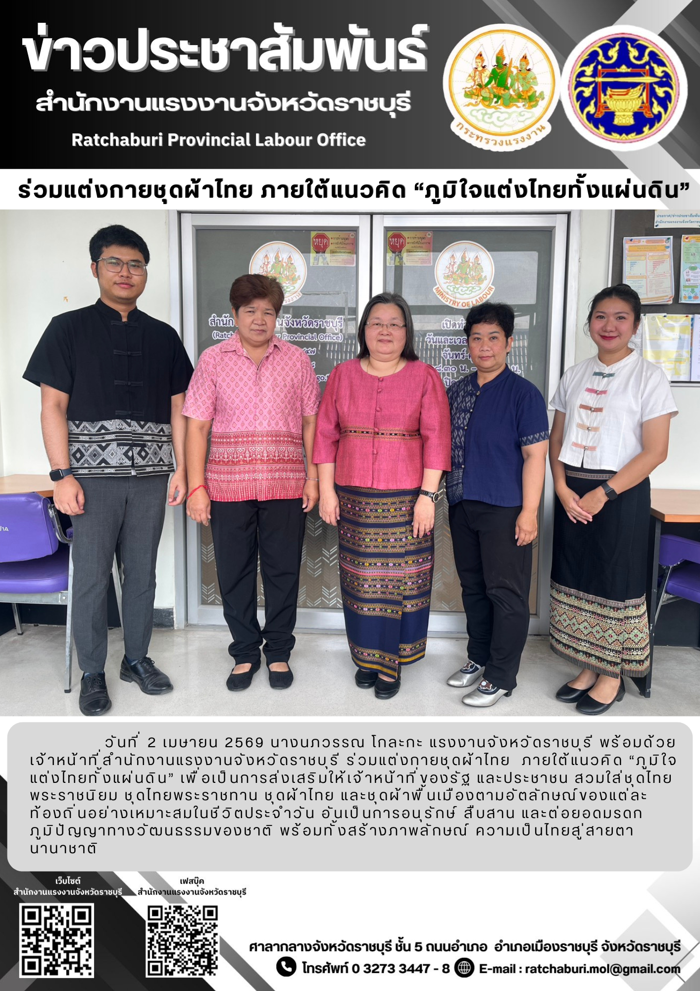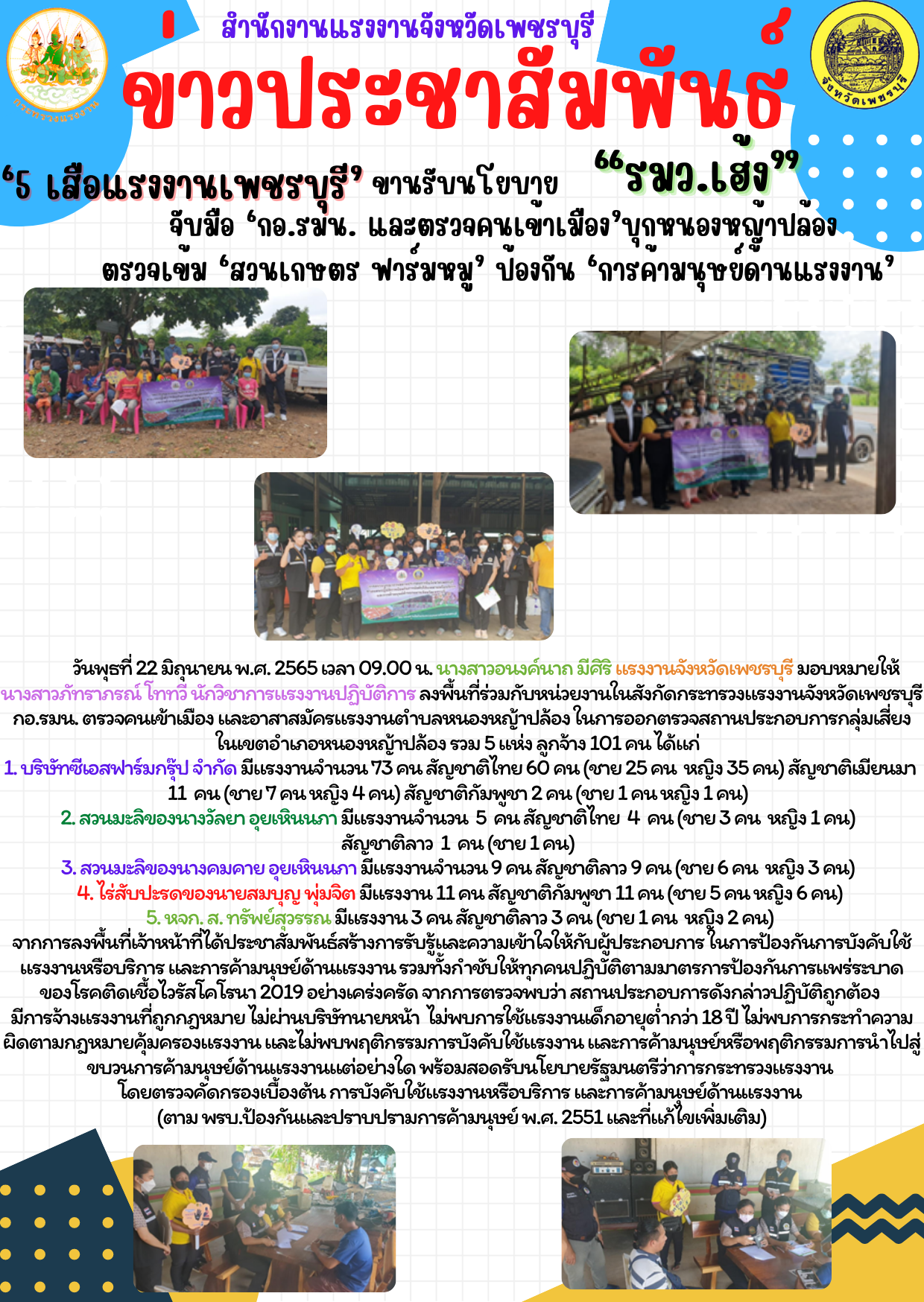 วันพุธที่ 22 มิถุนายน พ.ศ. 2565 เวลา 09.00 น. นางสาวอนงค์นาถ มีศิริ แรงงานจังหวัด มอบหมายให้ นางสาวภัทราภรณ์ โททวี นักวิชาการแรงงานปฏิบัติการ ลงพื้นที่ร่วมกับหน่วยงานในสังกัดกระทรวงแรงงานจังหวัดเพชรบุรี กอ.รมน. ตรวจคนเข้าเมือง และอาสาสมัครแรงงานตำบลหนองหญ้าปล้องในการออกตรวจสถานประกอบการกลุ่มเสี่ยง ในเขตอำเภอหนองหญ้าปล้อง รวม 5 แห่ง ลูกจ้าง 101 คน ได้แก่