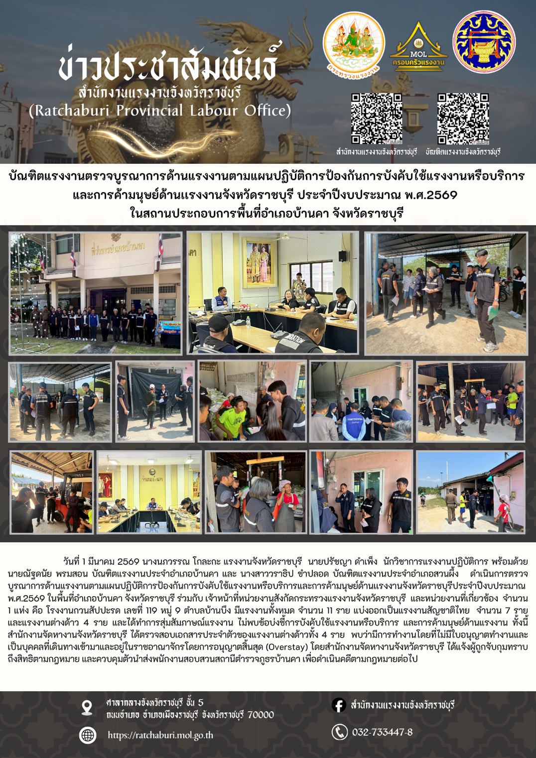 จากการลงพื้นที่เจ้าหน้าที่ได้ประชาสัมพันธ์สร้างการรับรู้และความเข้าใจให้กับผู้ประกอบการ ในการป้องกันการบังคับใช้แรงงานหรือบริการ และการค้ามนุษย์ด้านแรงงาน รวมทั้งกำชับให้ทุกคนปฏิบัติตามมาตรการป้องกันการแพร่ระบาดของโรคติดเชื้อไวรัสโคโรนา 2019 อย่างเคร่งครัด จากการตรวจพบว่า สถานประกอบการดังกล่าวปฏิบัติถูกต้อง มีการจ้างแรงงานที่ถูกกฎหมาย ไม่ผ่านบริษัทนายหน้า ไม่พบการใช้แรงงานเด็กอายุต่ำกว่า 18 ปี ไม่พบการกระทำความผิดตามกฎหมายคุ้มครองแรงงาน และไม่พบพฤติกรรมการบังคับใช้แรงงานและการค้ามนุษย์หรือพฤติกรรมการนำไปสู่ขบวนการค้ามนุษย์ด้านแรงงานแต่อย่างใด พร้อมสอดรับนโยบายรัฐมนตรีว่าการกระทรวงแรงงาน โดยตรวจคัดกรองเบื้องต้น การบังคับใช้แรงงานหรือบริการ และการค้ามนุษย์ด้านแรงงาน (ตาม พรบ.ป้องกันและปราบปรามการค้ามนุษย์ พ.ศ. 2551 และที่แก้ไขเพิ่มเติม)