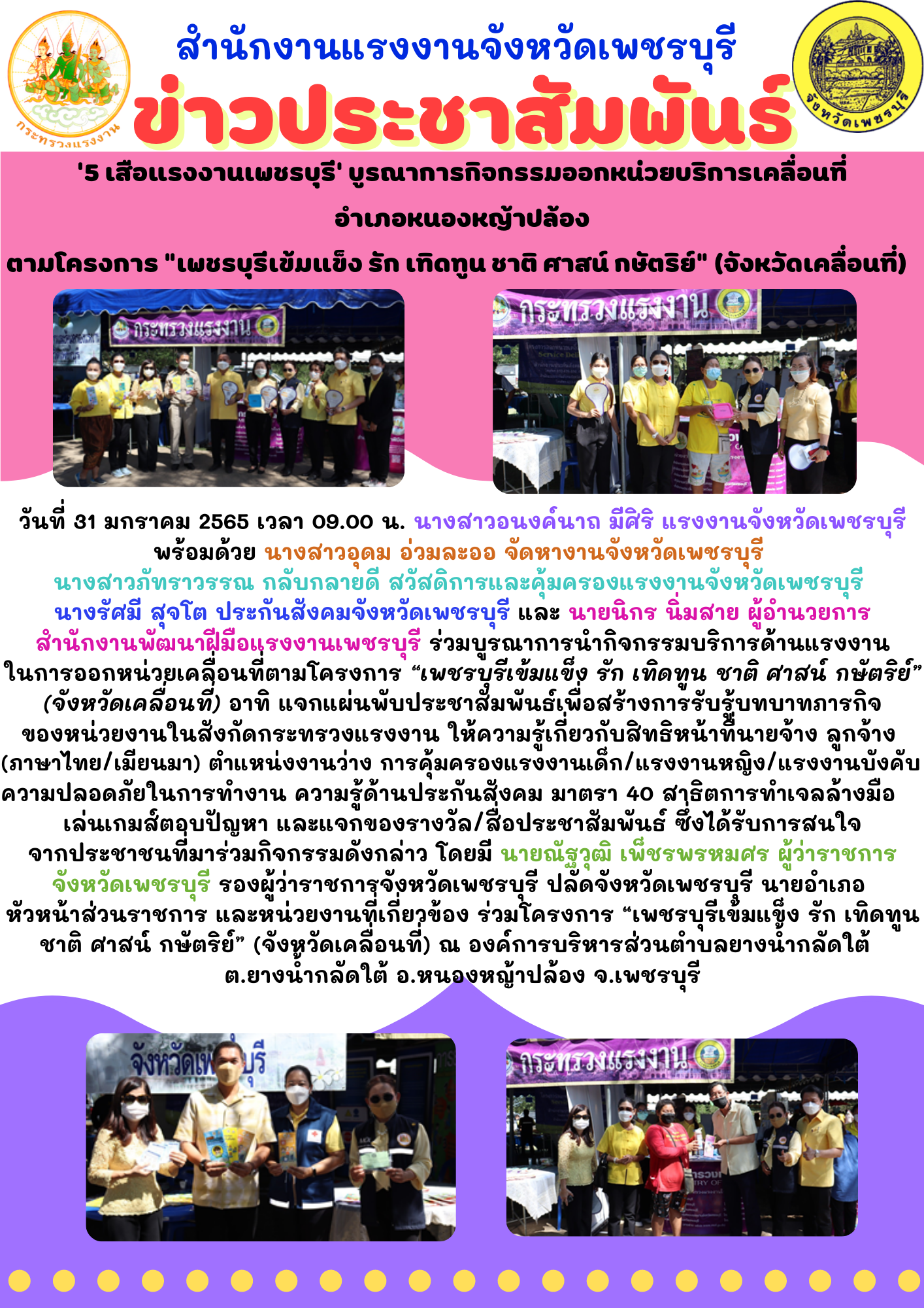 วันที่ 31 มกราคม 2565 เวลา 09.00 น. นางสาวอนงค์นาถ มีศิริ แรงงานจังหวัดเพชรบุรี พร้อมด้วย นางสาวอุดม อ่วมละออ จัดหางานจังหวัดเพชรบุรี นางสาวภัทราวรรณ กลับกลายดี สวัสดิการและคุ้มครองแรงงานจังหวัดเพชรบุรี นางรัศมี สุจโต ประกันสังคมจังหวัดเพชรบุรี และ นายนิกร นิ่มสาย ผู้อำนวยการสำนักงานพัฒนาฝีมือแรงงานเพชรบุรี ร่วมบูรณาการนำกิจกรรมบริการด้านแรงงานในการออกหน่วยเคลื่อนที่ตามโครงการ“เพชรบุรีเข้มแข็ง รัก เทิดทูน ชาติ ศาสน์ กษัตริย์” (จังหวัดเคลื่อนที่) อาทิ แจกแผ่นพับประชาสัมพันธ์เพื่อสร้างการรับรู้บทบาทภารกิจของหน่วยงานในสังกัดกระทรวงแรงงาน ให้ความรู้เกี่ยวกับสิทธิหน้าที่นายจ้าง ลูกจ้าง (ภาษาไทย/เมียนมา) ตำแหน่งงานว่าง การคุ้มครองแรงงานเด็ก/แรงงานหญิง/แรงงานบังคับ ความปลอดภัยในการทำงาน ความรู้ด้านประกันสังคม มาตรา 40 สาธิตการทำเจลล้างมือ เล่นเกมส์ตอบปัญหา และแจกของรางวัล/สื่อประชาสัมพันธ์ ซึ่งได้รับการสนใจจากประชาชนที่มาร่วมกิจกรรมดังกล่าว โดยมี นายณัฐวุฒิ เพ็ชรพรหมศร ผู้ว่าราชการจังหวัดเพชรบุรี รองผู้ว่าราชการจังหวัดเพชรบุรี ปลัดจังหวัดเพชรบุรี นายอำเภอ หัวหน้าส่วนราชการ และหน่วยงานที่เกี่ยวข้อง ร่วมโครงการ “เพชรบุรีเข้มแข็ง รัก เทิดทูน ชาติ ศาสน์ กษัตริย์” (จังหวัดเคลื่อนที่) ณ องค์การบริหารส่วนตำบลยางน้ำกลัดใต้ ต.ยางน้ำกลัดใต้ อ.หนองหญ้าปล้อง จ.เพชรบุรี