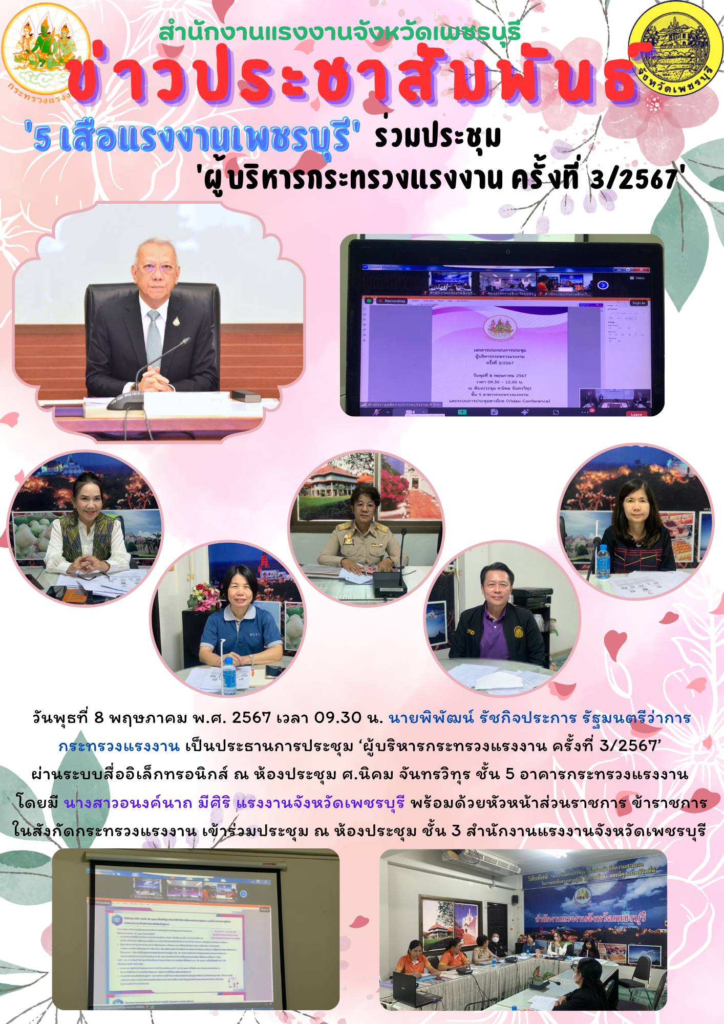 วันพุธที่ 8 พฤษภาคม พ.ศ. 2567 เวลา 09.30 น. นายพิพัฒน์ รัชกิจประการ รัฐมนตรีว่าการกระทรวงแรงงาน เป็นประธานการประชุม ‘ผู้บริหารกระทรวงแรงงาน ครั้งที่ 3/2567’ ผ่านระบบสื่ออิเล็กทรอนิกส์ ณ ห้องประชุม ศ.นิคม จันทรวิทุร ชั้น 5 อาคารกระทรวงแรงงาน โดยมี นางสาวอนงค์นาถ มีศิริ แรงงานจังหวัดเพชรบุรี พร้อมด้วยหัวหน้าส่วนราชการ ข้าราชการในสังกัดกระทรวงแรงงาน เข้าร่วมประชุม ณ สำนักงานแรงงานจังหวัดเพชรบุรี ชั้น 3 อำเภอเมืองเพชรบุรี จังหวัดเพชรบุรี