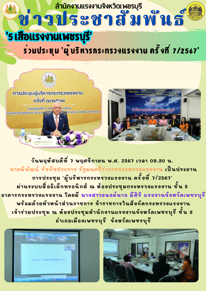 วันพฤหัสบดีที่ 7 พฤศจิกายน พ.ศ. 2567 เวลา 09.30 น. นายพิพัฒน์ รัชกิจประการ รัฐมนตรีว่าการกระทรวงแรงงาน เป็นประธานการประชุม ‘ผู้บริหารกระทรวงแรงงาน ครั้งที่ 7/2567’ ผ่านระบบสื่ออิเล็กทรอนิกส์ ณ ห้องประชุมกระทรวงแรงงาน ชั้น 5 อาคารกระทรวงแรงงาน โดยมี นางสาวอนงค์นาถ มีศิริ แรงงานจังหวัดเพชรบุรี พร้อมด้วยหัวหน้าส่วนราชการ ข้าราชการในสังกัดกระทรวงแรงงาน เข้าร่วมประชุม ณ ห้องประชุมสำนักงานแรงงานจังหวัดเพชรบุรี ชั้น 3 อำเภอเมืองเพชรบุรี จังหวัดเพชรบุรี