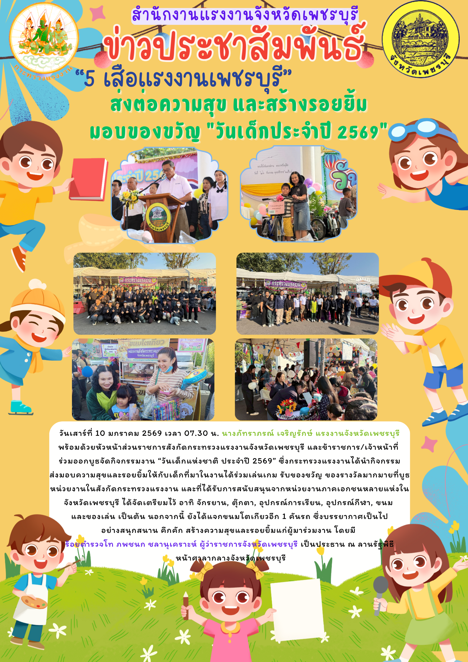 วันเสาร์ที่ 10 มกราคม 2569 เวลา 07.30 น. นางภัทราภรณ์ เจริญรักษ์ แรงงานจังหวัดเพชรบุรี พร้อมด้วยหัวหน้าส่วนราชการสังกัดกระทรวงแรงงานจังหวัดเพชรบุรี และข้าราชการ/เจ้าหน้าที่ ร่วมออกบูธจัดกิจกรรมงาน “วันเด็กแห่งชาติ ประจำปี 2569” ซึ่งกระทรวงแรงงานได้นำกิจกรรมส่งมอบความสุขและรอยยิ้มให้กับเด็กที่มาในงานได้ร่วมเล่นเกม รับของขวัญของรางวัลมากมายที่บูธหน่วยงานในสังกัดกระทรวงแรงงาน และที่ได้รับการสนับสนุนจากหน่วยงานภาคเอกชนหลายแห่งในจังหวัดเพชรบุรี ได้จัดเตรียมไว้ อาทิ จักรยาน, ตุ๊กตา, อุปกรณ์การเรียน, อุปกรณ์กีฬา, ขนม และของเล่น เป็นต้น นอกจากนี้ ยังได้แจกขนมโตเกียวอีก 1 คันรถ ซึ่งบรรยากาศเป็นไปอย่างสนุกสนาน คึกคัก สร้างความสุขและรอยยิ้มแก่ผู้มาร่วมงาน โดยมี ร้อยตำรวจโท ภพชนก ชลานุเคราะห์ ผู้ว่าราชการจังหวัดเพชรบุรี เป็นประธาน ณ ลานรัฐพิธี หน้าศาลากลางจังหวัดเพชรบุรี