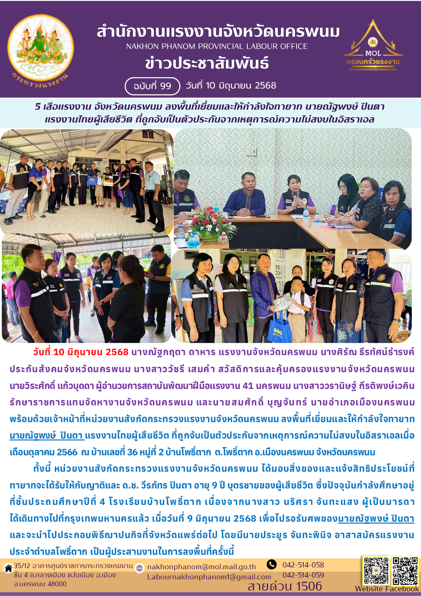 5 เสือแรงงาน จังหวัดนครพนม ลงพื้นที่เยี่ยมและให้กำลังใจทายาท นายณัฐพงษ์ ปินตา แรงงานไทยผู้เสียชีวิต ที่ถูกจับเป็นตัวประกันจากเหตุการณ์ความไม่สงบในอิสราเอล