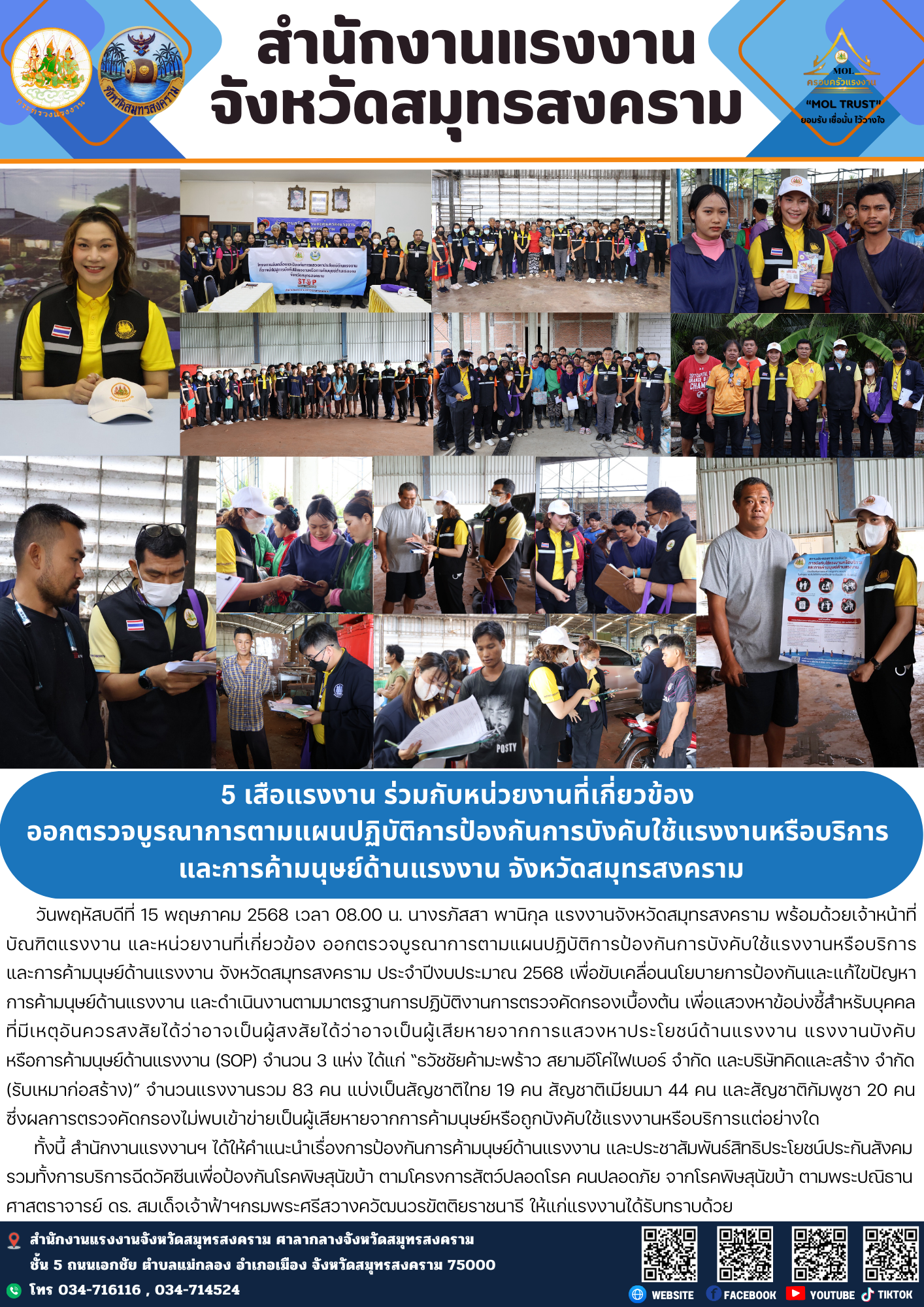 วันพฤหัสบดีที่ 15 พฤษภาคม 2568 เวลา 08.00 น. นางรภัสสา พานิกุล แรงงานจังหวัดสมุทรสงคราม พร้อมด้วยเจ้าหน้าที่บัณฑิตแรงงาน และหน่วยงานที่เกี่ยวข้อง ออกตรวจบูรณาการตามแผนปฏิบัติการป้องกันการบังคับใช้แรงงานหรือบริการและการค้ามนุษย์ด้านแรงงาน จังหวัดสมุทรสงคราม ประจำปีงบประมาณ 2568 เพื่อขับเคลื่อนนโยบายการป้องกันและแก้ไขปัญหาการค้ามนุษย์ด้านแรงงาน และดำเนินงานตามมาตรฐานการปฏิบัติงานการตรวจคัดกรองเบื้องต้น เพื่อแสวงหาข้อบ่งชี้สำหรับบุคคลที่มีเหตุอันควรสงสัยได้ว่าอาจเป็นผู้สงสัยได้ว่าอาจเป็นผู้เสียหายจากการแสวงหาประโยชน์ด้านแรงงาน แรงงานบังคับหรือการค้ามนุษย์ด้านแรงงาน (SOP) จำนวน 3 แห่ง ได้แก่ “ธวัชชัยค้ามะพร้าว สยามอีโค่ไฟเบอร์ จำกัด และบริษัทคิดและสร้าง จำกัด(รับเหมาก่อสร้าง)” จำนวนแรงงานรวม 83 คน แบ่งเป็นสัญชาติไทย 19 คน สัญชาติเมียนมา 44 คน และสัญชาติกัมพูชา 20 คนซึ่งผลการตรวจคัดกรองไม่พบเข้าข่ายเป็นผู้เสียหายจากการค้ามนุษย์หรือถูกบังคับใช้แรงงานหรือบริการแต่อย่างใด