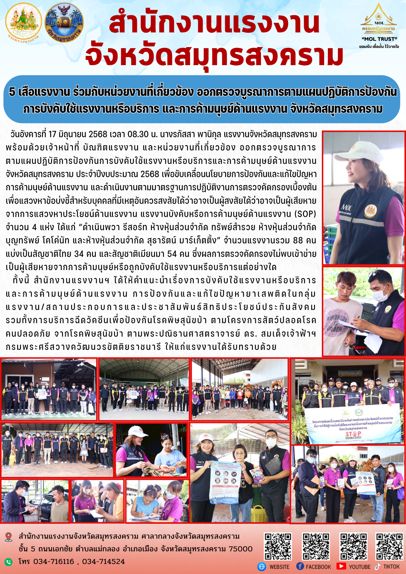วันอังคารที่ 17 มิถุนายน 2568 เวลา 08.30 น. นางรภัสสา พานิกุล แรงงานจังหวัดสมุทรสงคราม พร้อมด้วยเจ้าหน้าที่ บัณฑิตแรงงาน และหน่วยงานที่เกี่ยวข้อง ออกตรวจบูรณาการตามแผนปฏิบัติการป้องกันการบังคับใช้แรงงานหรือบริการและการค้ามนุษย์ด้านแรงงานจังหวัดสมุทรสงคราม ประจำปีงบประมาณ 2568 เพื่อขับเคลื่อนนโยบายการป้องกันและแก้ไขปัญหาการค้ามนุษย์ด้านแรงงาน และดำเนินงานตามมาตรฐานการปฏิบัติงานการตรวจคัดกรองเบื้องต้น เพื่อแสวงหาข้อบ่งชี้สำหรับบุคคลที่มีเหตุอันควรสงสัยได้ว่าอาจเป็นผู้สงสัยได้ว่าอาจเป็นผู้เสียหายจากการแสวงหาประโยชน์ด้านแรงงาน แรงงานบังคับหรือการค้ามนุษย์ด้านแรงงาน (SOP) จำนวน 4 แห่ง ได้แก่ “ดำเนินพวา รีสอร์ท ห้างหุ้นส่วนจำกัด ทรัพย์สำรวย ห้างหุ้นส่วนจำกัด บุญทรัพย์ โคโค่นัท และห้างหุ้นส่วนจำกัด สุธารัตน์ มาร์เก็ตติ้ง” จำนวนแรงงานรวม 88 คน แบ่งเป็นสัญชาติไทย 34 คน และสัญชาติเมียนมา 54 คน ซึ่งผลการตรวจคัดกรองไม่พบเข้าข่าย เป็นผู้เสียหายจากการค้ามนุษย์หรือถูกบังคับใช้แรงงานหรือบริการแต่อย่างใดทั้งนี้ สำนักงานแรงงานฯ ได้ให้คำแนะนำเรื่องการบังคับใช้แรงงานหรือบริการและการค้ามนุษย์ด้านแรงงาน การป้องกันและแก้ไขปัญหายาเสพติดในกลุ่มแรงงาน/สถานประกอบการและประชาสัมพันธ์สิทธิประโยชน์ประกันสังคม รวมทั้งการบริการฉีดวัคซีนเพื่อป้องกันโรคพิษสุนัขบ้า ตามโครงการสัตว์ปลอดโรค คนปลอดภัย จากโรคพิษสุนัขบ้า ตามพระปณิธานศาสตราจารย์ ดร. สมเด็จเจ้าฟ้าฯ กรมพระศรีสวางควัฒนวรขัตติยราชนารี ให้แก่แรงงานได้รับทราบด้วย