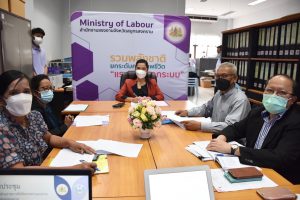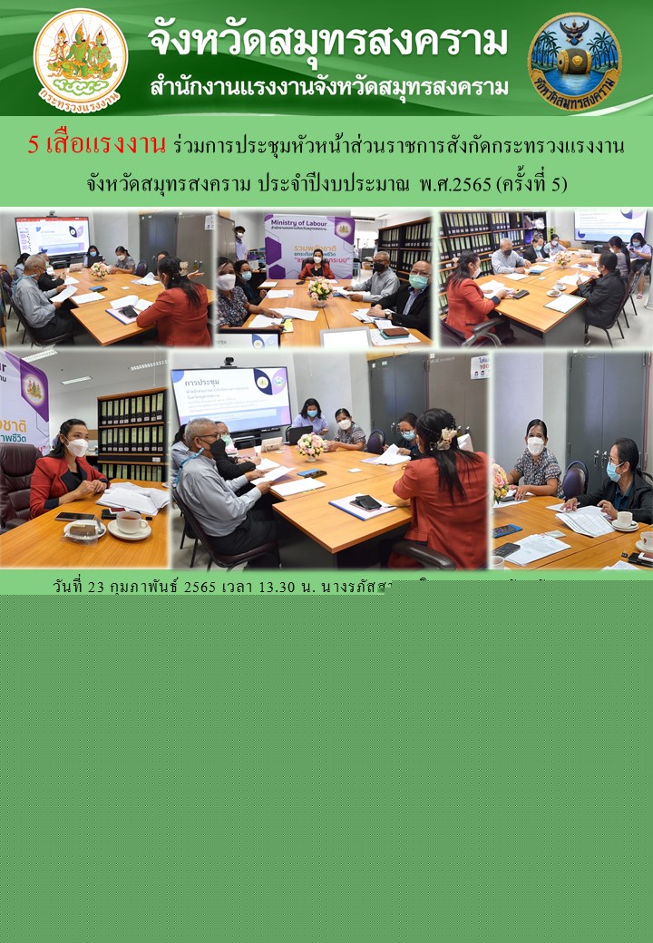 วันที่ 23 กุมภาพันธ์ 2565 เวลา 13.30 น. นางรภัสสา พานิกุล แรงงานจังหวัดสมุทรสงคราม เป็นประธานในการประชุมหัวหน้าส่วนราชการสังกัดกระทรวงแรงงานจังหวัดสมุทรสงคราม ประจำปีงบประมาณ พ.ศ. 2565 (ครั้งที่ 5) และการประชุมคณะกรรมการศูนย์ปฏิบัติการป้องกันการค้ามนุษย์ด้านแรงงานจังหวัดสมุทรสงคราม ประจำปีงบประมาณ พ.ศ. 2565 (ครั้งที่ 3) โดยมีหัวหน้าส่วนราชการสังกัดกระทรวงแรงงานจังหวัดสมุทรสงครามและผู้แทน เข้าร่วมการประชุม ณ ห้องประชุมสำนักงานแรงงานจังหวัดสมุทรสงคราม มีวาระเพื่อทราบติดตามผลการดำเนินการของหน่วยงาน แผนการดำเนินงานในเดือนมีนาคม 2565 การบริหารจัดการแรงงานต่างด้าว การรายงานผลการดำเนินงานโครงการต่างๆ กำหนดการประชุมตรวจราชการ กิจกรรมเฉลิมพระเกียรติสมเด็จพระนางเจ้าสิริกิติ์ พระบรมราชินีนาถ พระบรมราชชนนีพันปีหลวง และมีวาระเพื่อพิจารณาการดำเนินการตามแนวทางการขับเคลื่อนมาตรการป้องกันและควบคุมโรคในพื้นที่เฉพาะ (Bubble and Seal)และการพิจารณาคัดเลือกอาสาสมัครแรงงานดีเด่นระดับจังหวัดสมุทรสงคราม ประจำปีงบประมาณ พ.ศ. 2565