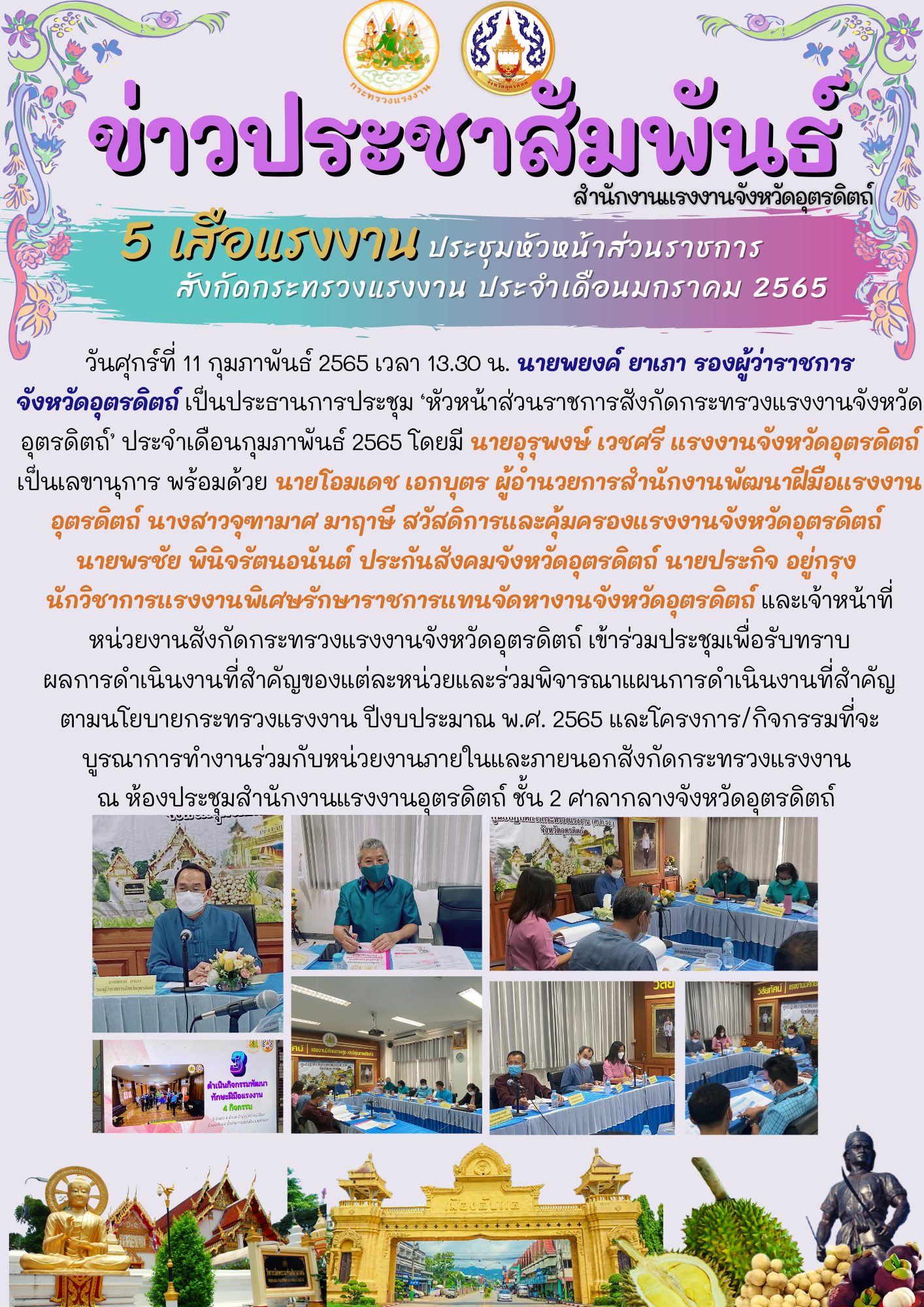 วันศุกร์ที่ 11 กุมภาพันธ์ 2565 เวลา 13.30 น. นายพยงค์ ยาเภา รองผู้ว่าราชการจังหวัดอุตรดิตถ์ เป็นประธานการประชุม ‘หัวหน้าส่วนราชการสังกัดกระทรวงแรงงานจังหวัดอุตรดิตถ์’ ประจำเดือนกุมภาพันธ์ 2565 โดยมี นายอุรุพงษ์ เวชศรี แรงงานจังหวัดอุตรดิตถ์ เป็นเลขานุการ พร้อมด้วย นายโอมเดช เอกบุตร ผู้อำนวยการสำนักงานพัฒนาฝีมือแรงงานอุตรดิตถ์นางสาวจุฑามาศ มาฤาษี สวัสดิการและคุ้มครองแรงงานจังหวัดอุตรดิตถ์ นายพรชัย พินิจรัตนอนันต์ ประกันสังคมจังหวัดอุตรดิตถ์ นายประกิจ อยู่กรุง นักวิชาการแรงงานพิเศษรักษาราชการแทนจัดหางานจังหวัดอุตรดิตถ์ และเจ้าหน้าที่หน่วยงานสังกัดกระทรวงแรงงานจังหวัดอุตรดิตถ์ เข้าร่วมประชุมเพื่อรับทราบผลการดำเนินงานที่สำคัญของแต่ละหน่วยและร่วมพิจารณาแผนการดำเนินงานที่สำคัญ ตามนโยบายกระทรวงแรงงาน ปีงบประมาณ พ.ศ. 2565 และโครงการ/กิจกรรมที่จะบูรณาการทำงานร่วมกับหน่วยงานภายในและภายนอกสังกัดกระทรวงแรงงาน ณ ห้องประชุมสำนักงานแรงงานอุตรดิตถ์ ชั้น 2 ศาลากลางจังหวัดอุตรดิตถ์