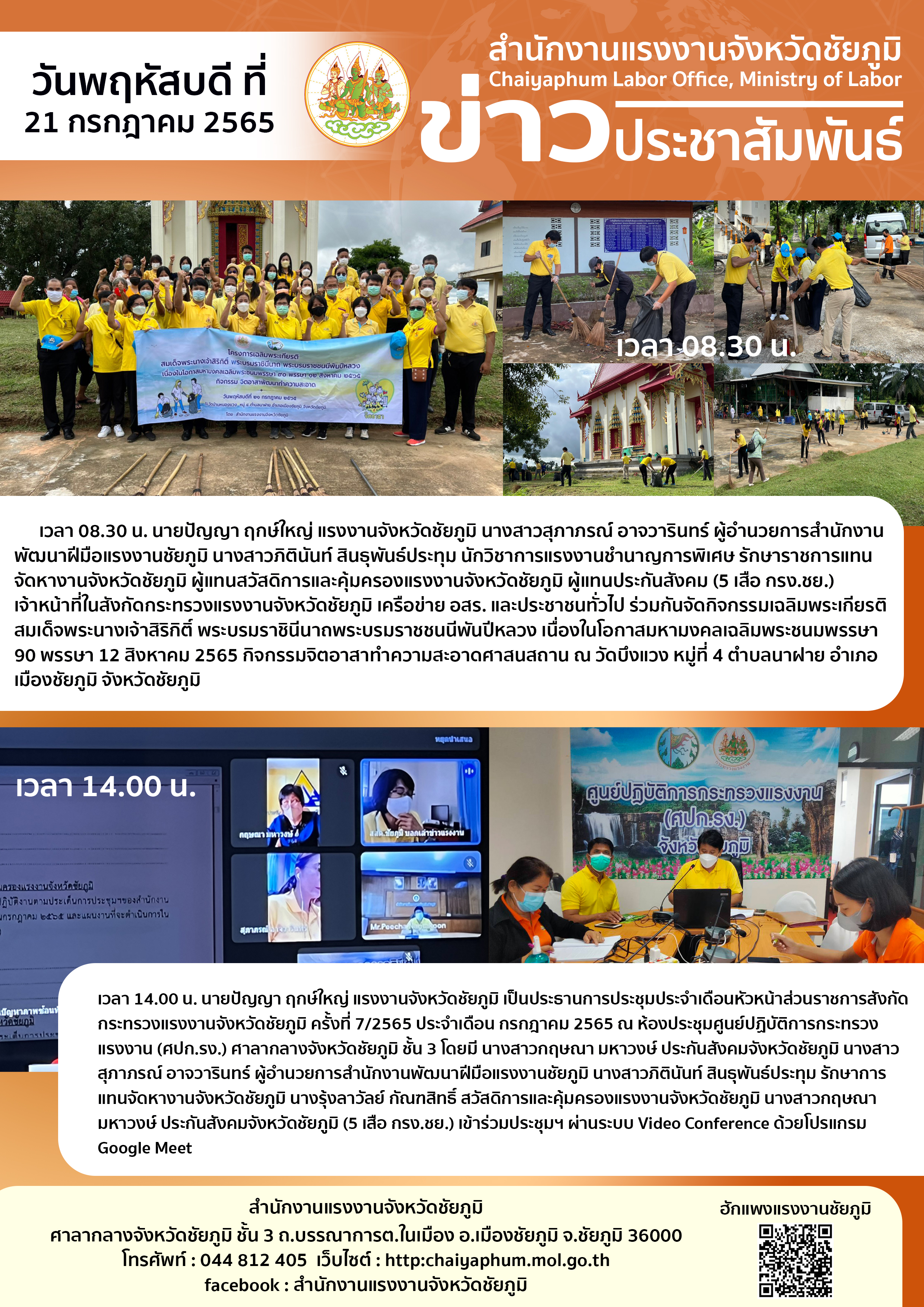 เจ้าหน้าที่ในสังกัดกระทรวงแรงงานจังหวัดชัยภูมิ เครือข่าย อสร. และประชาชนทั่วไป ร่วมกันจัดกิจกรรมเฉลิมพระเกียรติสมเด็จพระนางเจ้าสิริกิติ์ พระบรมราชินีนาถพระบรมราชชนนีพันปีหลวง เนื่องในโอกาสมหามงคลเฉลิมพระชนมพรรษา 90 พรรษา 12 สิงหาคม 2565 กิจกรรมจิตอาสาทำความสะอาดศาสนสถาน ณ วัดบึงแวง หมู่ที่ 4 ตำบลนาฝาย อำเภอเมืองชัยภูมิ จังหวัดชัยภูมิ