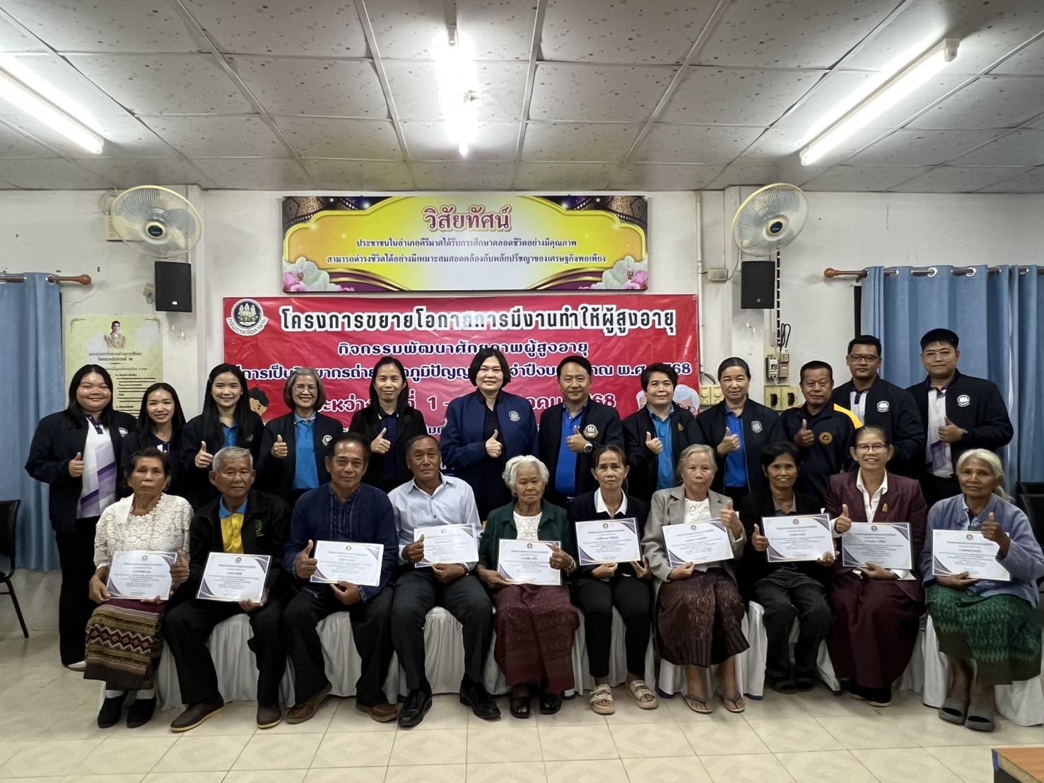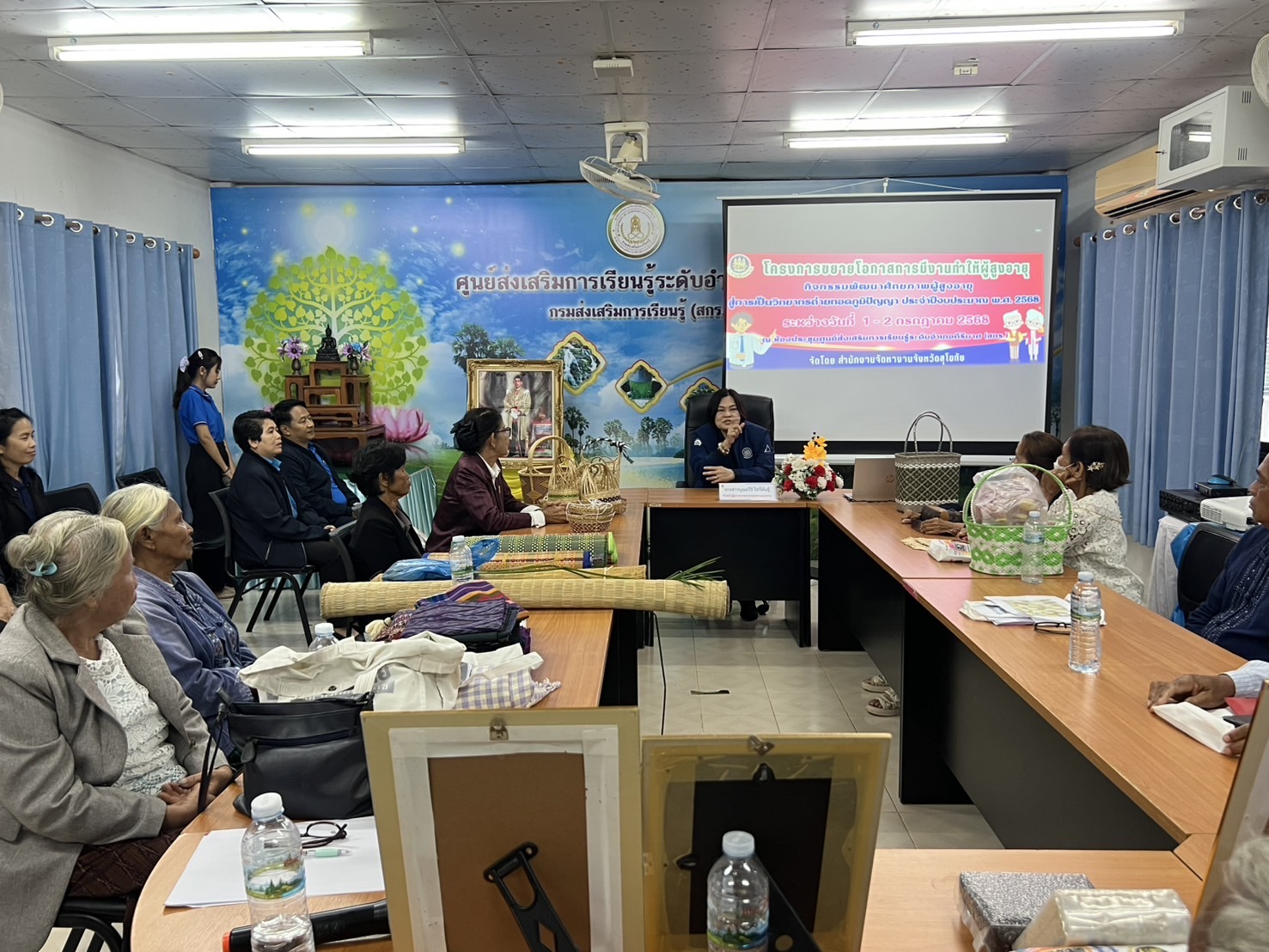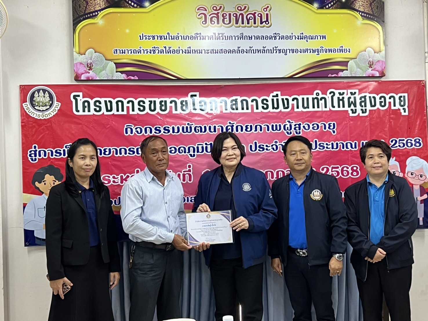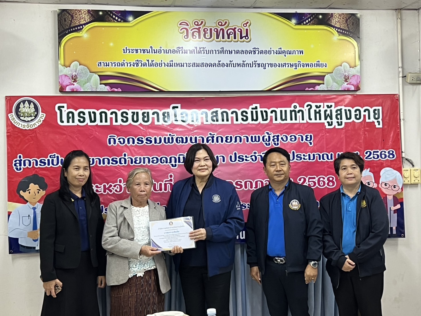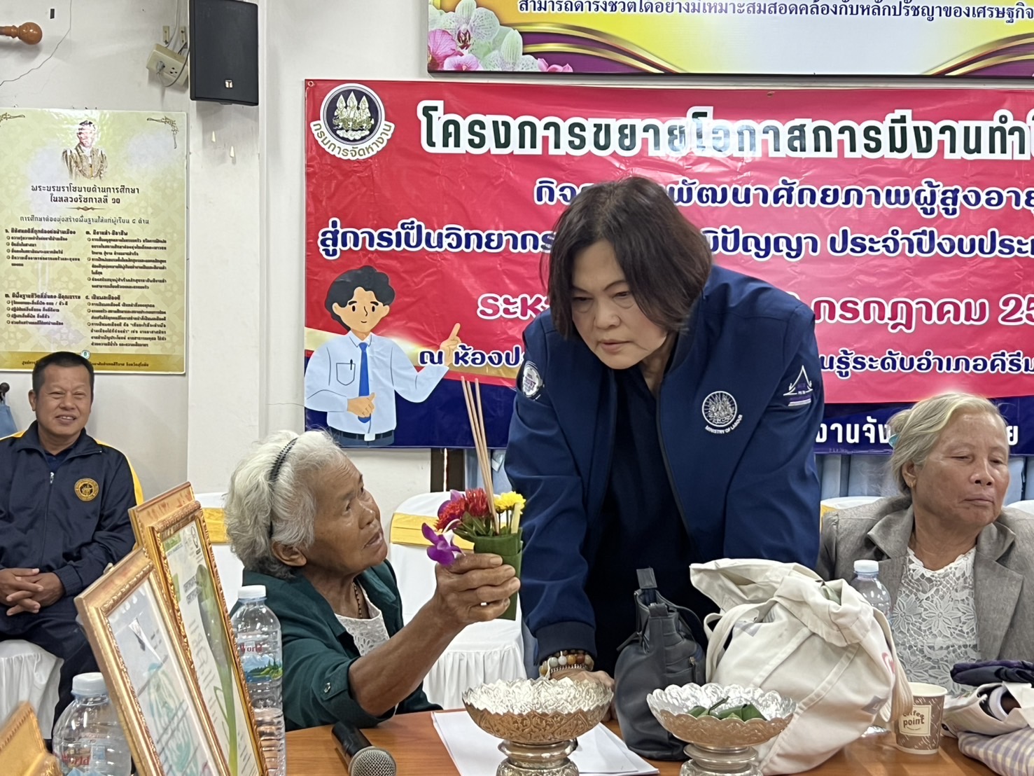 หลังจากนั้น หัวหน้าผู้ตรวจราชการกระทรวงแรงงาน และคณะ ได้ลงพื้นที่ตรวจติดตามการบูรณาการเครือข่ายระหว่างบัณฑิตแรงงานและอาสาสมัครแรงงาน อำเภอกงไกรลาศ (11 ตำบล) โครงการเพิ่มประสิทธิภาพการให้บริการด้านแรงงานของบัณฑิตแรงงานในพื้นที่ ณ ห้องประชุมพระกงไกรลาศ ชั้น 3 ที่ว่าการอำเภอกงไกรลาศ จังหวัดสุโขทัย พร้อมตรวจติดตามโครงการขยายโอกาสการมีงานทำให้ผู้สูงอายุกิจกรรม ส่งเสริมและพัฒนาภูมิปัญญาผู้สูงอายุ ประจำปีงบประมาณ พ.ศ. 2568 การฝึกอบรมหลักสูตรการพัฒนาศักยภาพผู้สูงอายุสู่การเป็นวิทยากรถ่ายทอดภูมิปัญญา ณ ห้องประชุมศูนย์ส่งเสริมการเรียนรู้ระดับอำเภอคีรีมาศ (สกร.) ตำบลโตนด อำเภอคีรีมาส จังหวัดสุโขทัย