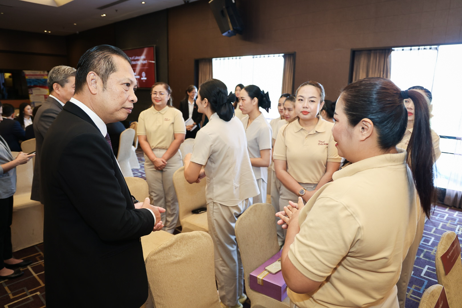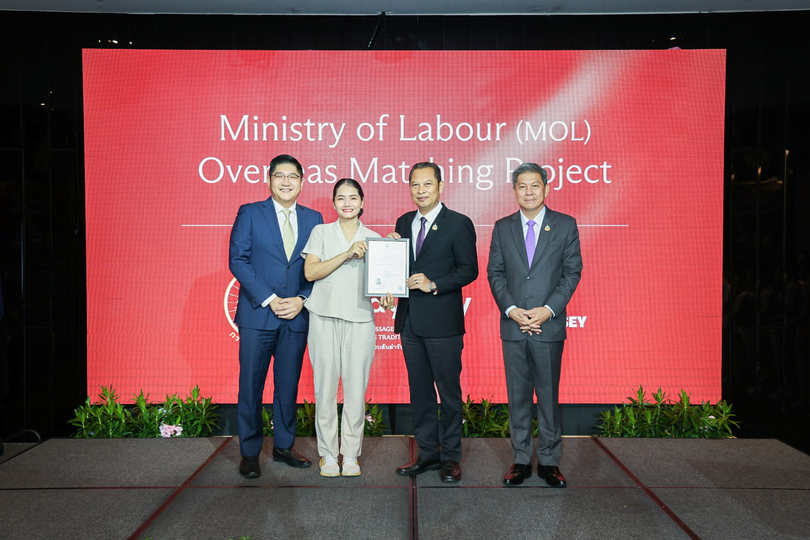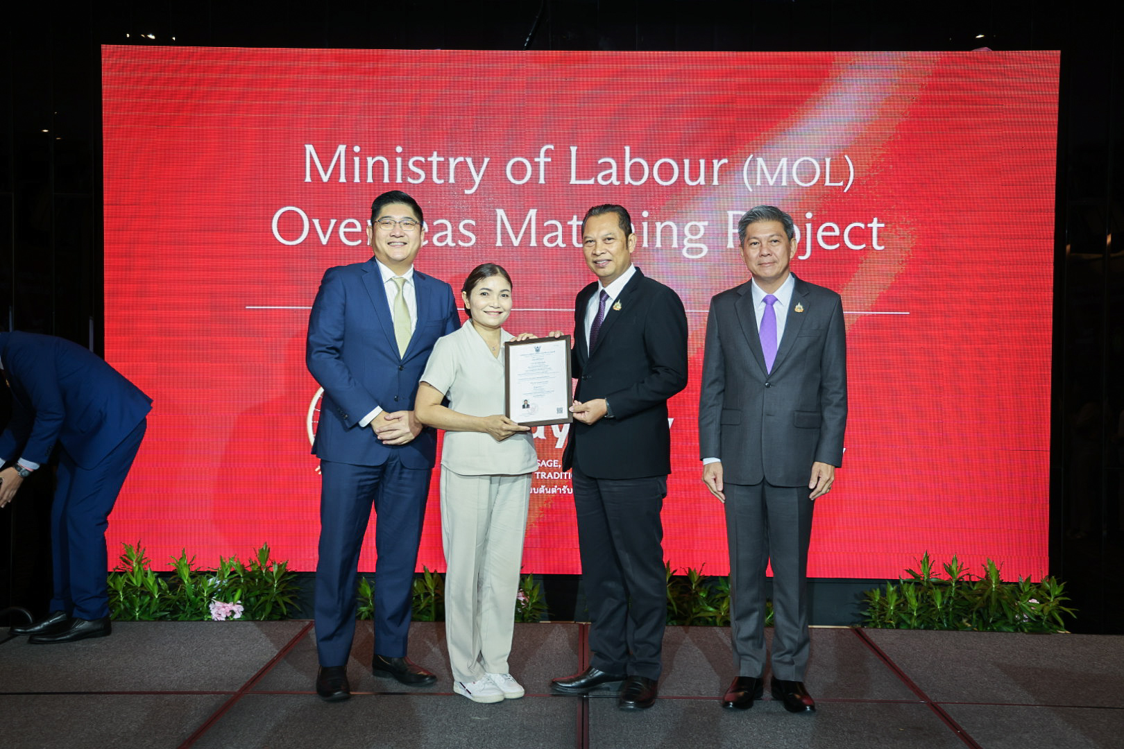 หลังจากนั้น นายศักดินาถ สนธิศักดิ์โยธิน ผู้ช่วยปลัดกระทรวงแรงงาน ยังได้เป็นประธานมอบประกาศนียบัตร ผู้ผ่านการทดสอบมาตรฐานฝีมือแรงงานแห่งชาติ สาขา พนักงานนวดไทย ระดับ 1 ประเทศมาเลเซีย จำนวน 11 ราย และเยี่ยมชมกิจกรรม Mol Overseas Matching เยี่ยมชมบูธกรมการจัดหางาน และพบปะพูดคุยกับอาสาสมัครแรงงาน ด้วย