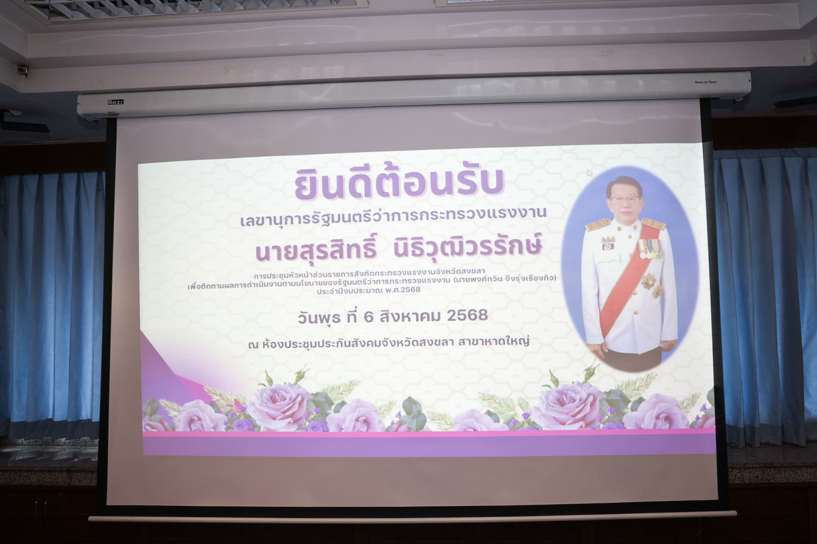 วันที่ 6 สิงหาคม 2568 เวลา 14.00 น. นายพงศ์กวิน จึงรุ่งเรืองกิจ รัฐมนตรีว่าการกระทรวงแรงงาน มอบหมายให้ นายสุรสิทธิ์ นิธิวุฒิวรรักษ์ เลขานุการรัฐมนตรีว่าการกระทรวงแรงงาน เป็นประธานการประชุมหัวหน้าส่วนราชการสังกัดกระทรวงแรงงานจังหวัดสงขลา โดยมี นางอมรวรรณ ช่วงเพ็ชจินดา แรงงานจังหวัดสงขลา นำเสนอสรุปผลการดำเนินงานตามนโยบายของรัฐมนตรีว่าการกระทรวงแรงงาน “การจัดระเบียบแรงงานต่างด้าวที่ทำงานในประเทศไทยอย่างเร่งด่วน” ปัญหา/อุปสรรค และผลการดำเนินงานอื่นๆ ที่สำคัญ นาวาตรี วิทวัส กู้ประเสริฐ คณะที่ปรึกษารัฐมนตรีว่าการกระทรวงแรงงาน ผู้บริหารระดับสูงสังกัดกระทรวงแรงงาน พร้อมด้วยหัวหน้าส่วนราชการสังกัดกระทรวงแรงงานจังหวัดสงขลา ร่วมประชุมด้วย ณ สำนักงานประกันสังคมจังหวัดสงขลา สาขาหาดใหญ่ อำเภอหาดใหญ่ จังหวัดสงขลา